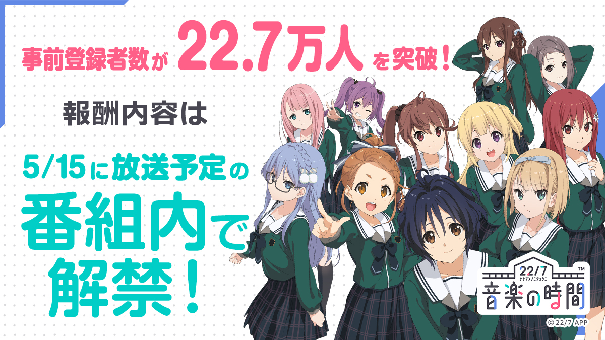 由製作人秋元康、日本 SONY 音樂(Sony Music Records)以及 Aniplex 合作打造的數位偶像企劃《22/7》所延伸之音樂節奏遊戲《22/7 音樂的時間》宣布事前登錄已突破 22 萬 7 千人,預計在 5 月 15 日播出直播節目「ナナニジ ROOM ~enjoy stay home~」。