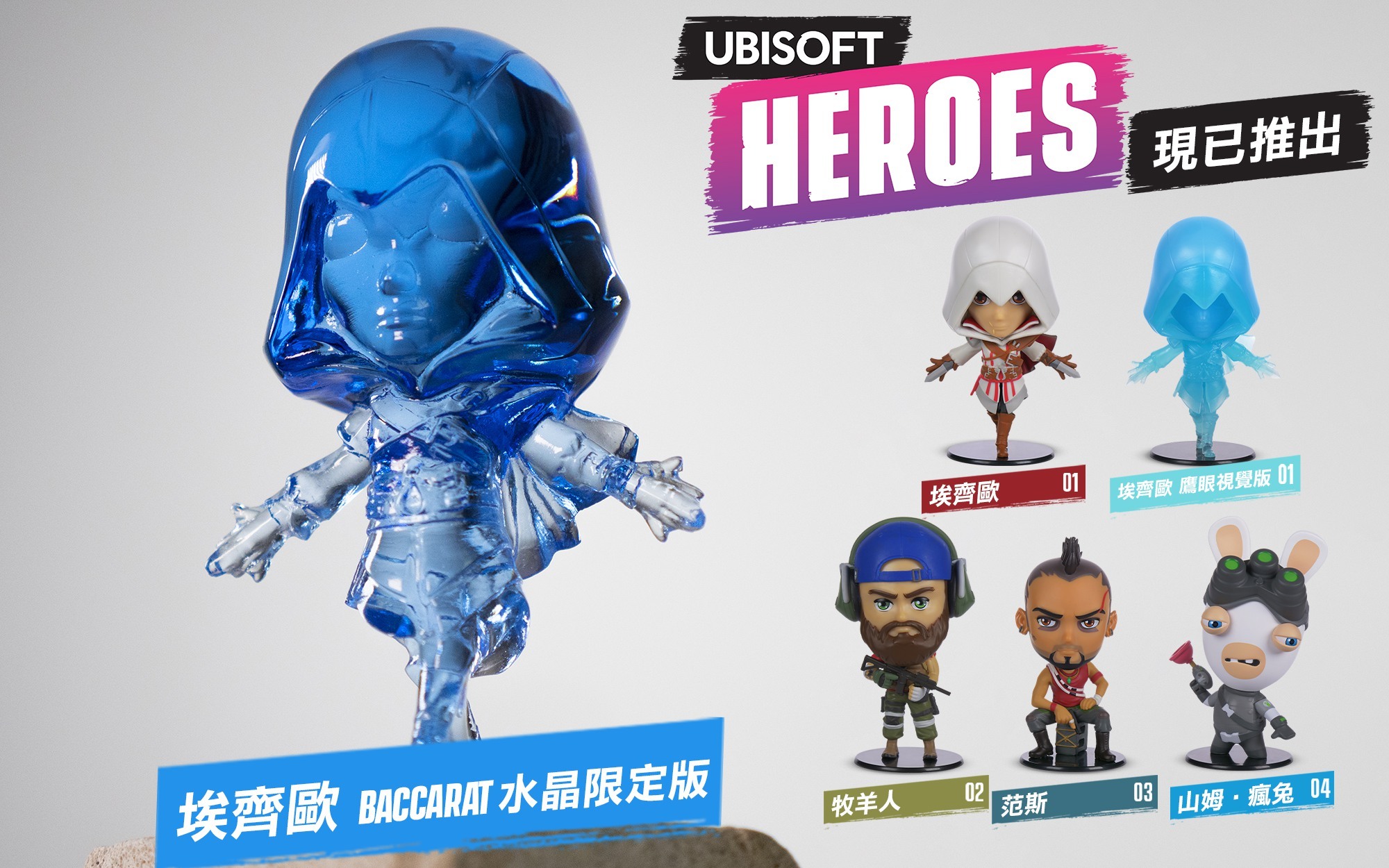 Ubisoft 另也宣佈與全球最負盛名的水晶製造商 Baccarat 獨家合作。為慶祝 Ubisoft 英雄公仔第一彈正式推出,Ubisoft 與 Baccarat 合作推出特別的藍水晶作品向《刺客教條》著名人物埃齊歐・奧迪托雷致敬。這款由 Baccarat 工匠手工製作的作品展現了這個擁有 256 年歷史的水晶品牌的獨家工藝。Baccarat 以其吹製師、鍍金師、雕刻師和切割師的獨特技法聞名於世。Baccarat 完美再現了 Ubisoft 英雄公仔版的埃齊歐,呈現了這位戴斯蒙.邁爾斯的祖先及其「鷹眼視覺」。玩家現在只要購買任一盒第一彈公仔,就有機會獲得這款特殊限量版作品。