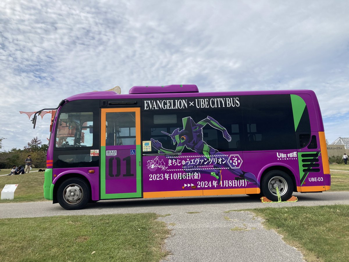「滿城福音戰士第 3 彈」活動期間,還會有專屬的福音戰士巴士在宇部市間行駛,初號機的配色十分顯眼。