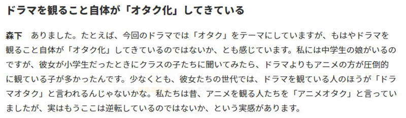 單純就喜歡一種興趣的人數來說,會被稱作「宅」的興趣通常就不是主流文化。因此森下佳子才會覺得「電視劇宅」取代「動畫宅」代表著日劇業界整體的危機!而且這些變化在各個層面都會發生,編劇該如何吸引新世代的年輕人呢?這就成為日劇業界煩惱的大問題了……
