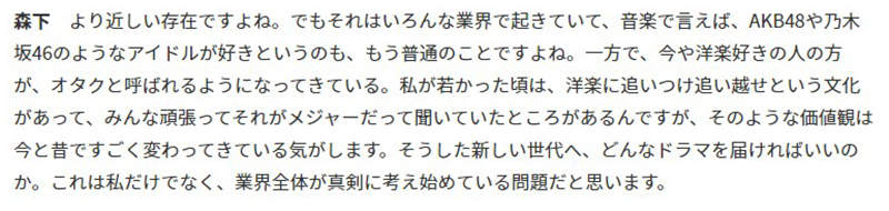 「就以音樂來說,現在喜歡AKB48或乃木坂46這些偶像已經是很普通的事情,反觀喜歡西洋音樂的人就被稱作宅宅了。我年輕的時候大家都瘋狂追求西洋音樂,可以感受到價值觀發生了很大的變化。因此要如何為新世代打造電視劇,這不只是我,而是業界全體應該認真思考的問題」