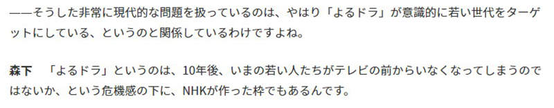 「其實NHK會設計深夜劇的時段,就是感受到當今的年輕人在10年以後可能都不電視的危機」