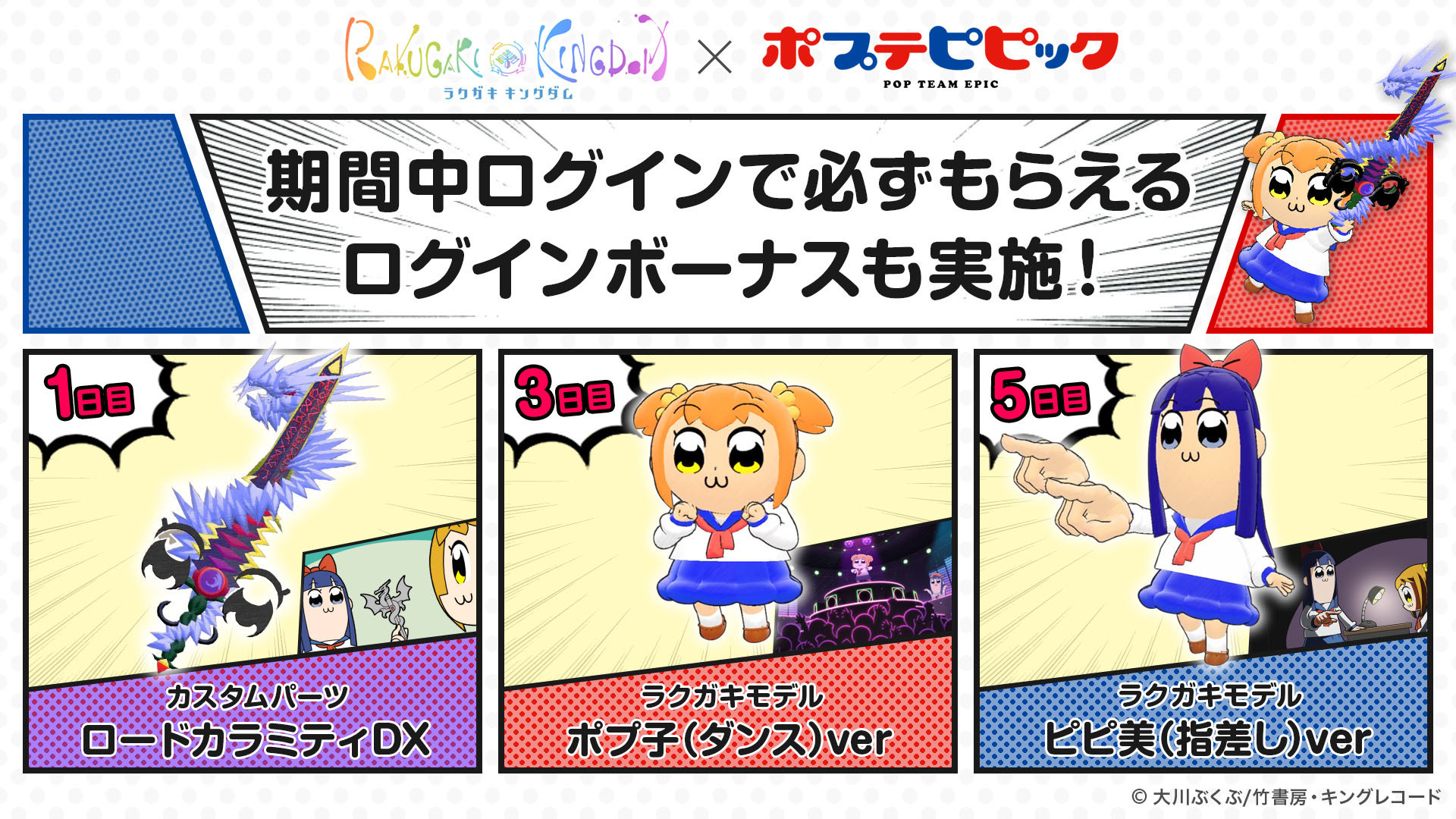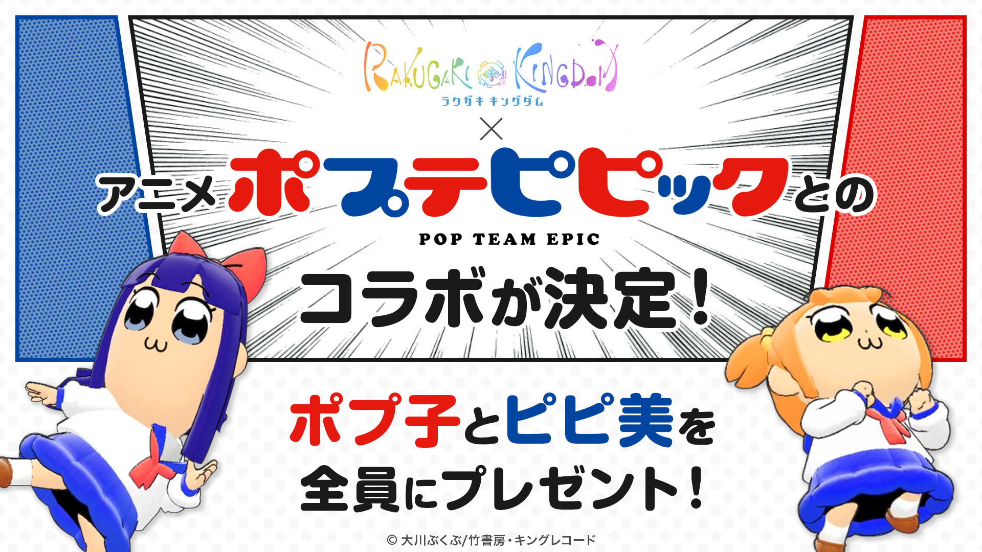 株式會社 TAITO(タイトー)預計今夏推出的智慧型手機新作 RPG《塗鴉王國(暫譯,ラクガキ キングダム)》(iOS/Android)今日宣布,將在遊戲上市的同時與人氣動畫《POP TEAM EPIC(ポプテピピック)》展開合作,贈送全體玩家「POP 子」及「PIPI 美」的塗鴉模型。