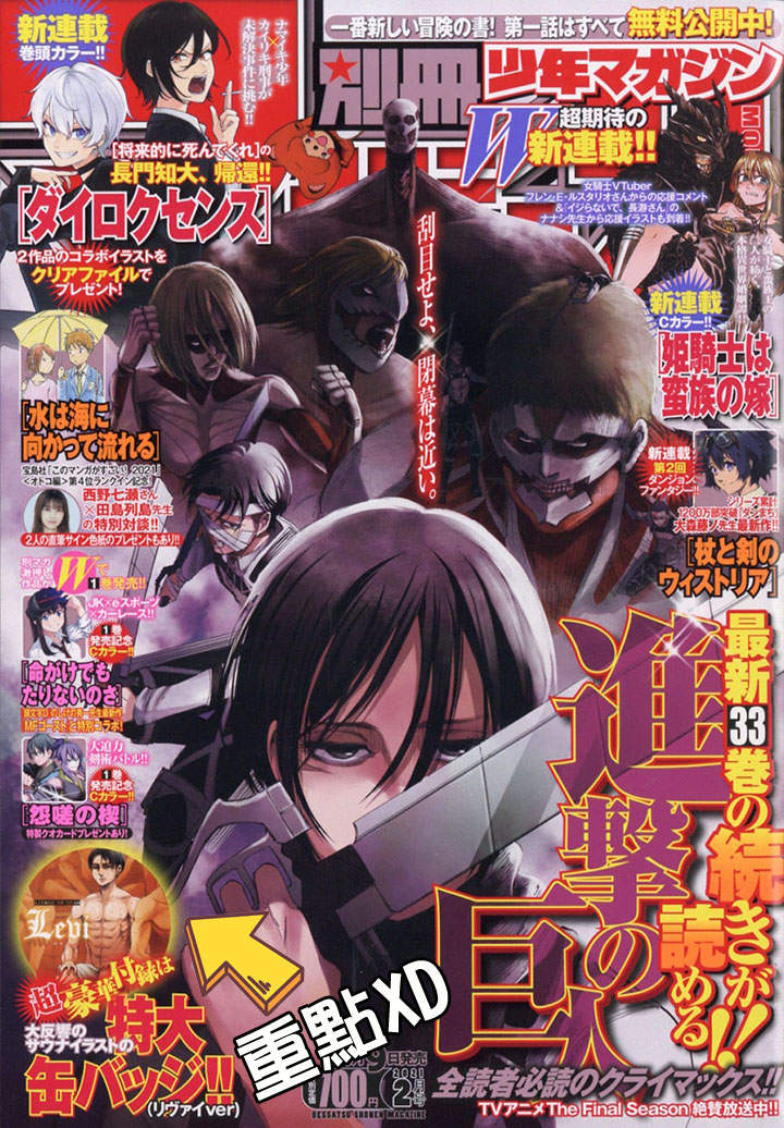 「別冊少年MAGAZINE」2月號這期以進擊的巨人為封面,這期的銷量可以說非常好,一方面是因為劇情接近尾聲,其次是買書還附贈了里維兵長上空桑拿的胸章,總之增加買氣讓雜誌獲得了前所未有的銷售佳績