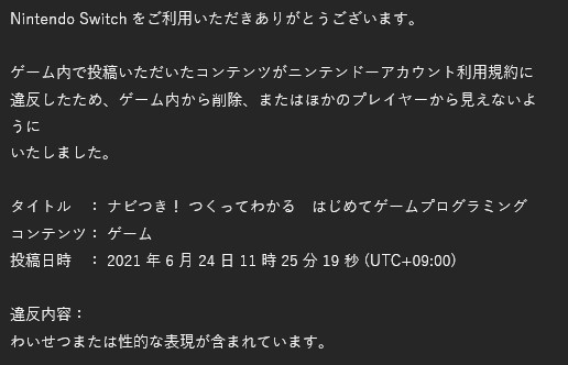 遺憾的是,就在昨(27)晚,ちぷしし還是收到了來自任天堂寄來的違反使用者規範通知信,要求自主刪除已上傳的遊戲,避免被其他玩家看見。