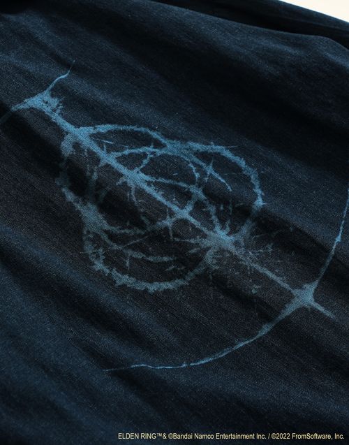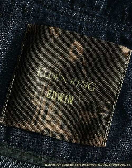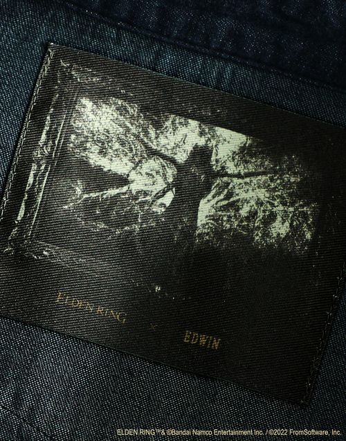EDWIN 表示,將活用其在丹寧布(牛仔布)的經驗與技術,透過在藍色丹寧布上追加黑色染料進行二次染色的「過染(Over Dyed)加工」來展現適合《艾爾登法環》黑暗奇幻主題的藍黑色色彩。並透過雷射加工技術將遊戲的標誌細緻重現在服飾上。充分傳達在《艾爾登法環》遊戲舞台「交界地」冒險的深邃感。