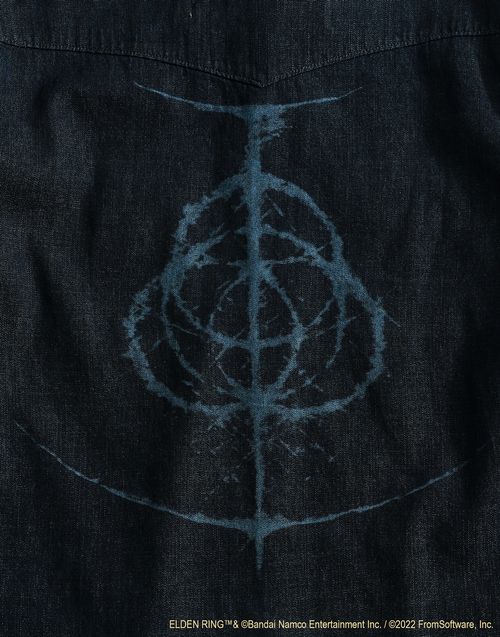 艾爾登法環》合作的單寧襯衫是 EDWIN 招牌系列商品,背面以雷射刻印有遊戲的標誌。