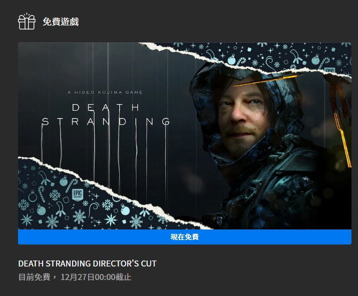 Epic Games Store(EGS)趁歐美耶誕假期,昨(26日)天凌晨在官方首頁顯示《死亡擱淺 導演版》限時一天免費領取,吸引爆量玩家湧入領取、造成 EGS 系統一度無法負荷。然而在官方緊急維修後,玩家發現贈送的遊戲被換成了最初的《死亡擱淺》一般版,後來更有部分已經領取到免費《死亡擱淺 導演版》的玩家,傳出遊戲似乎遭到回收,因而引發許多人在官方 Twitter 抱怨。