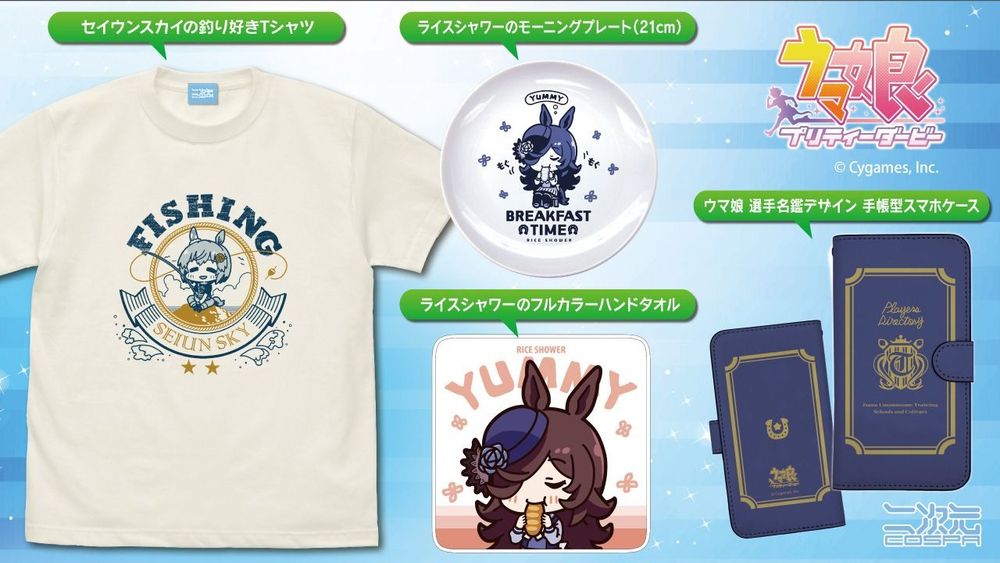 Cospa 公布旗下品牌「二次元 Cospa」將推出的《賽馬娘 Pretty Derby》全新商品,目前已透過官方網站進行預購,預購截止日期至 6 月 11 日。本次推出的商品有「米浴的彩色擦手巾」日幣 715 圓(含稅)、「米浴的早餐盤」日幣 1,980 圓(含稅)、「青雲天空的釣魚愛好者 T 恤」日幣 3,300 圓(含稅)、「賽馬娘 選手名鑑款 掀蓋式手機殼」日幣 4,180 / 4,400 / 4,620 圓(含稅)四種,其中 T 恤與手機殼將提供多種尺寸。
