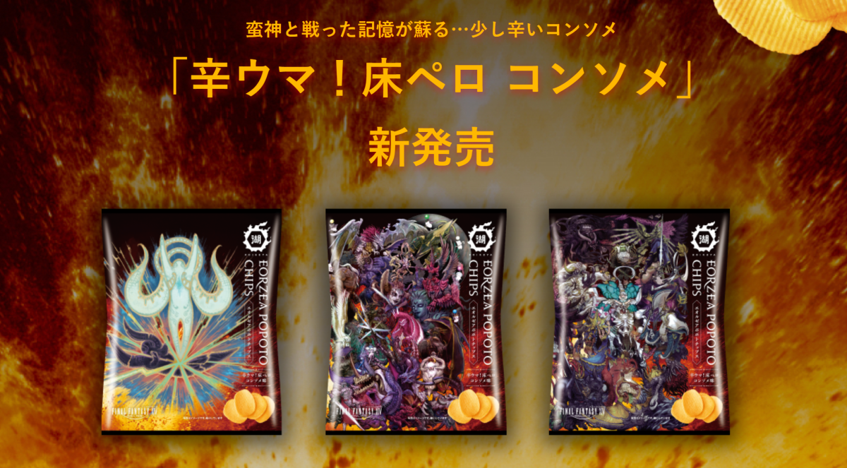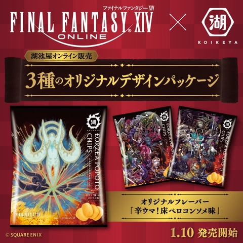 25日宣布與日本零食廠牌湖池屋合作,推出趣味的「辛ウマ! 床ペロコンソメ味」限定口味,推出三款包裝供消費者選擇,將會在 FINAL FANTASY XIV FAN FESTIVAL 2024 會場先行販售,其後於湖池屋線上商店限定販售。