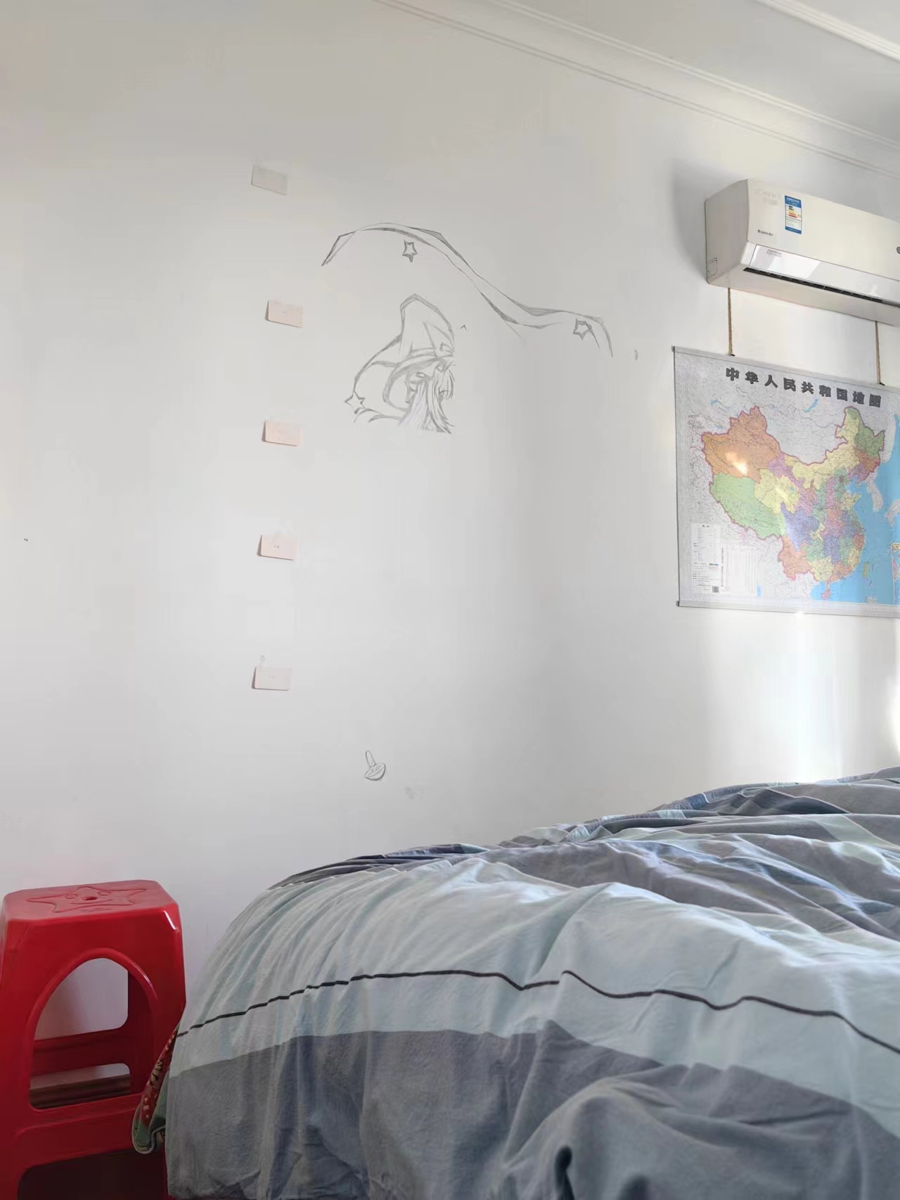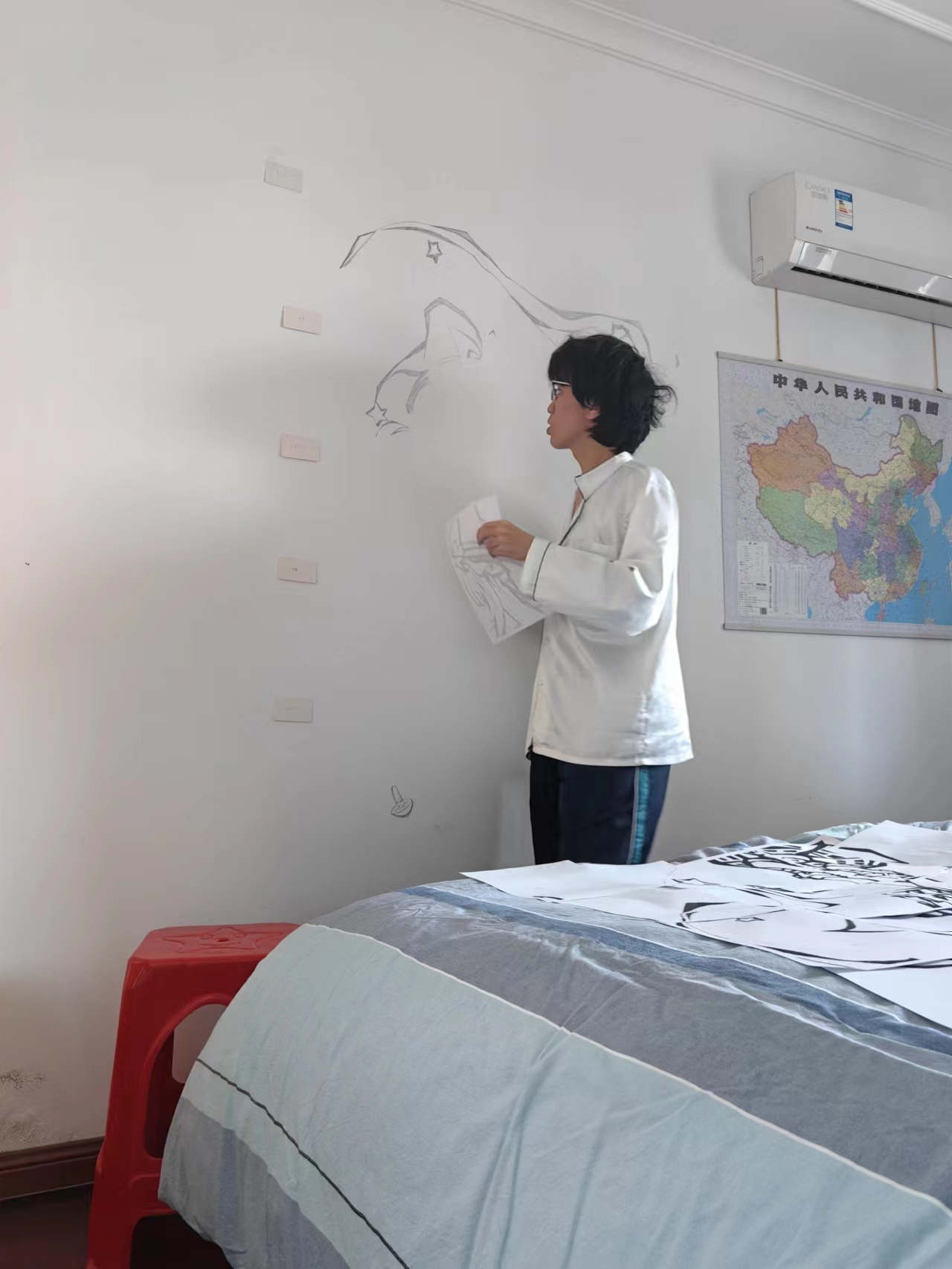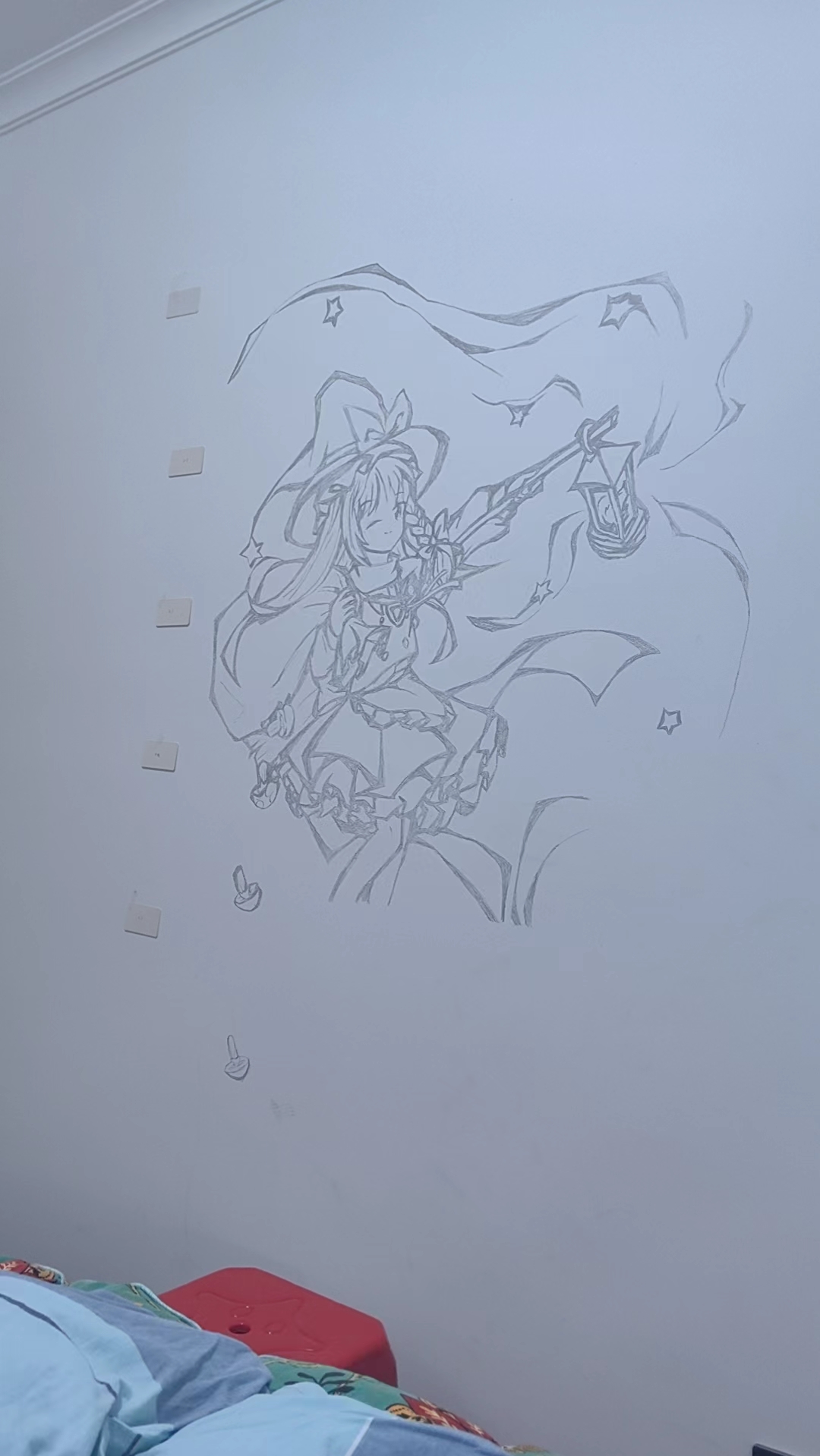 索性画在靠床旁边的墙上了...