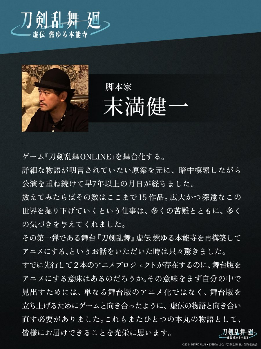 另外這次《刀劍亂舞 迴 -虚傳 燃燒的本能寺-》是沿用同名舞台劇的劇情,找來原舞台劇腳本家末滿健一擔綱系列構成,他也表示從事相關舞台劇已經有不少作品,以刀劍亂舞的世界觀來說非常廣大,自認為一步步以來都是挑戰,這次到了動畫的,能參與腳本感到非常光榮