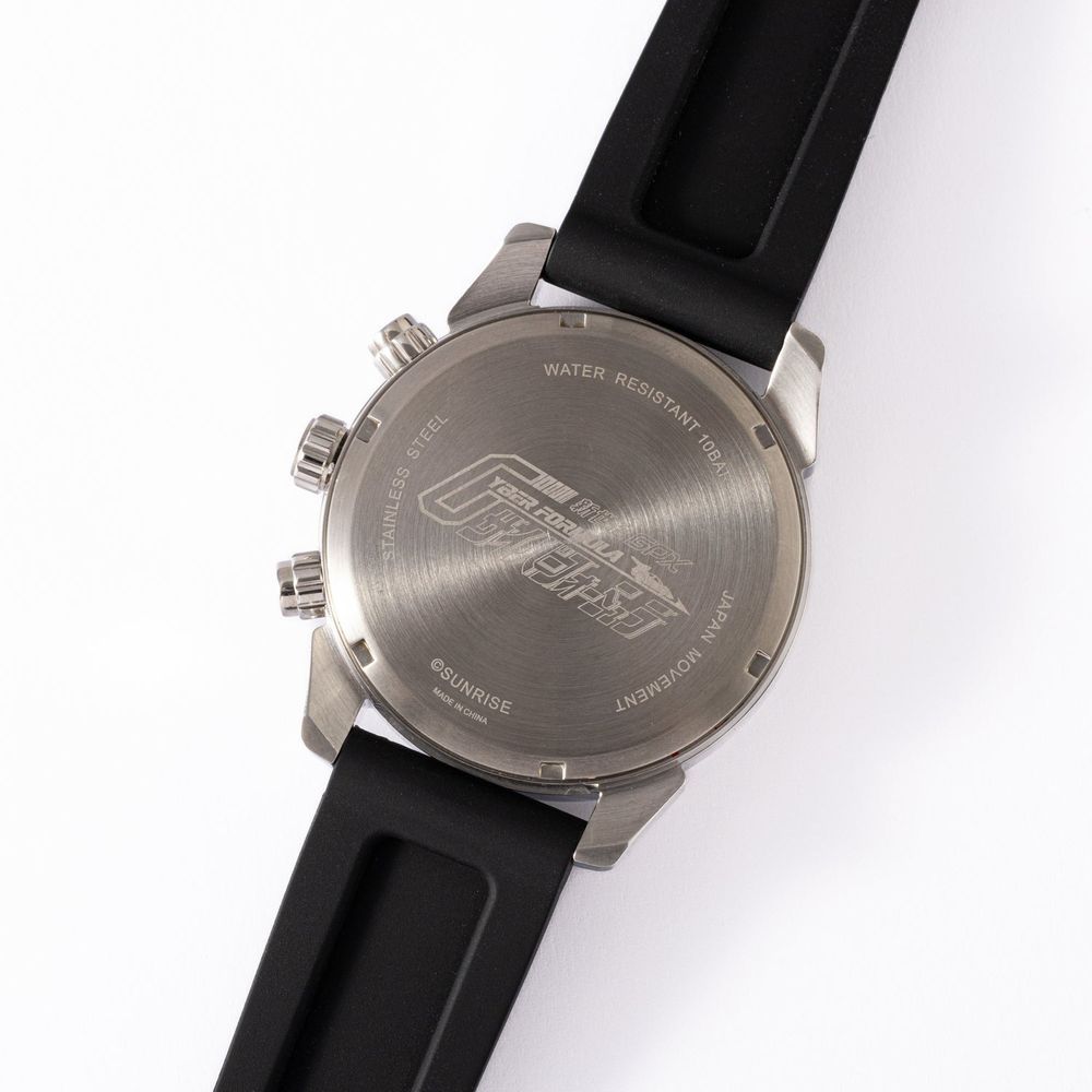 腕錶的設計融入了車身象徵的 SUGO 標誌、配色以及細節,錶帶的部份則採用了舒適的矽膠材質,錶背則刻有作品名稱的 logo。而在外套的部分則以藍色和黑色作為搭配,備有男性的 M、L、XL 三種尺寸供選擇,外套上也裝飾有 SUGO 等象徵性圖樣。