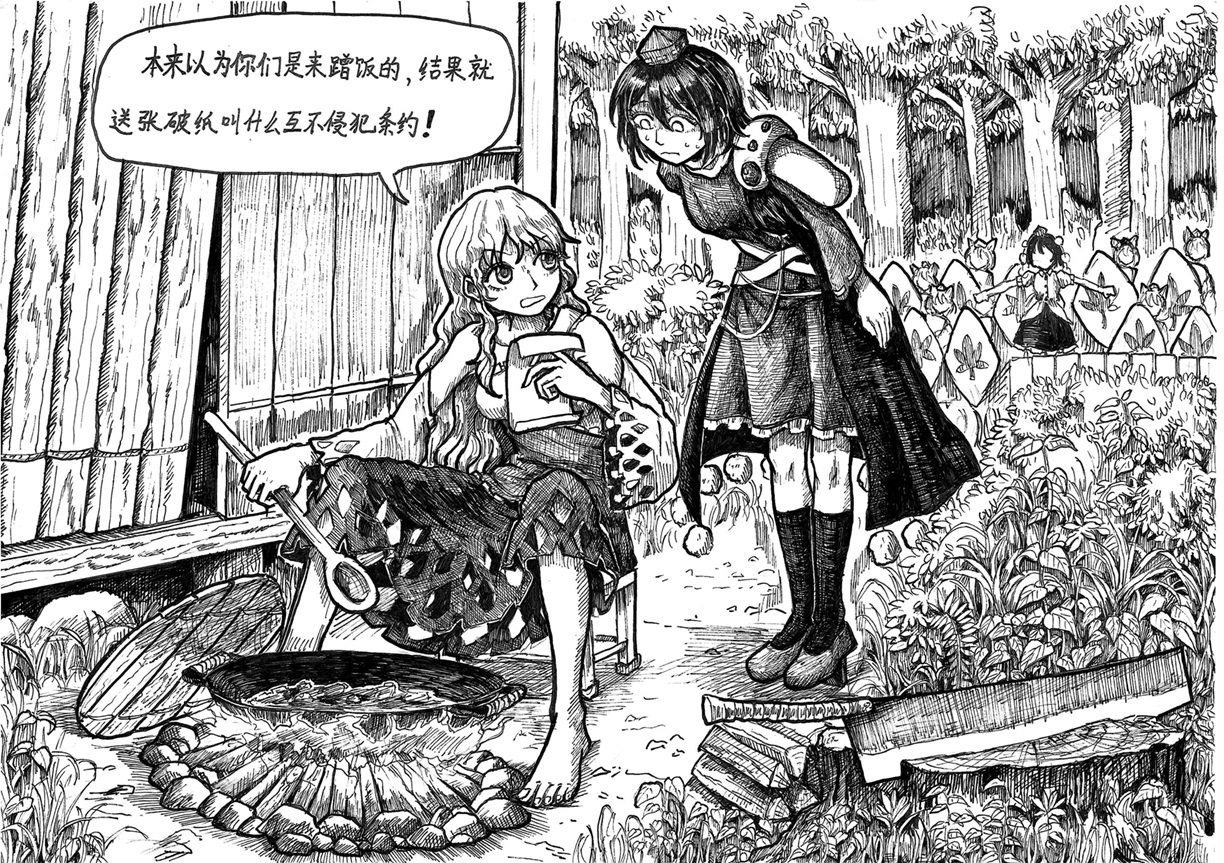 天狗已经列好队来防御了,天狗和山姥关系很紧张啊。不过锅里煮的是什么呢?有什么事边吃边说也许可以讲讲。