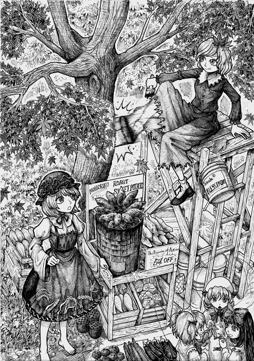 秋穰子卖着蔬菜(三妖精,来烤红薯吧),而秋静叶在刷红叶,每一棵树都得这么踢的话,秋静叶的脚力其实不小。对了,脚运动起来那里很清楚,很有动感。