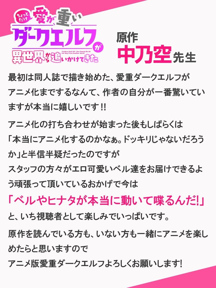 由中乃空創作,於 WEB Comic Gamma+(竹書房)連載的漫畫作品《愛有點沉重的暗黑精靈從異世界緊追不放》,官方於(6)日發表電視動畫化的消息。