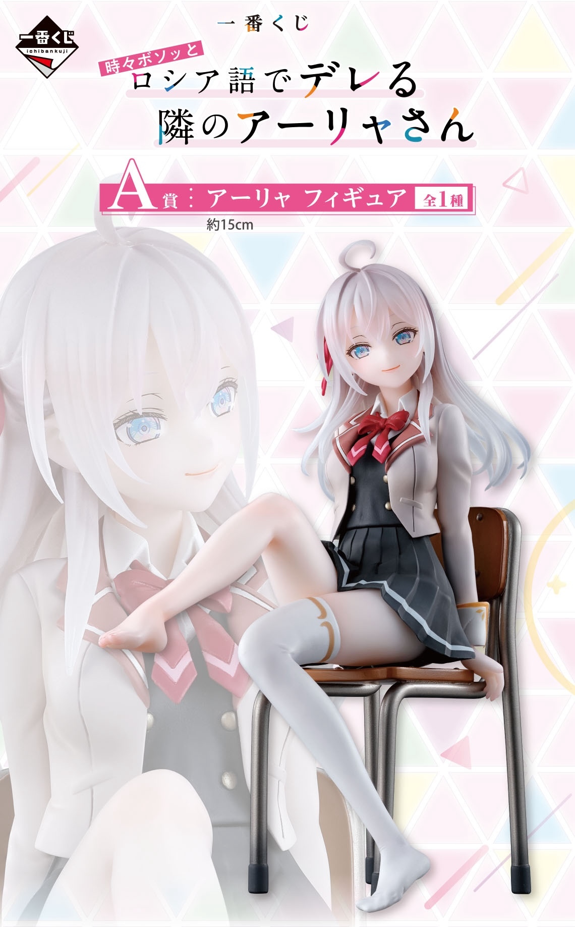 本次的「一番賞 不時輕聲地以俄語遮羞的鄰座艾莉同學」提供A~F、最後一賞與雙重中獎賞等不同級別的賞品。其中A賞為參考動畫第一集中艾莉請政近幫忙穿襪子的場景打造的角色模型,還原她坐在椅子上的動態,雕刻再現她纖細的長腿,白皙的肌膚看起來吹彈可破,腳趾的造型也被細膩還原!