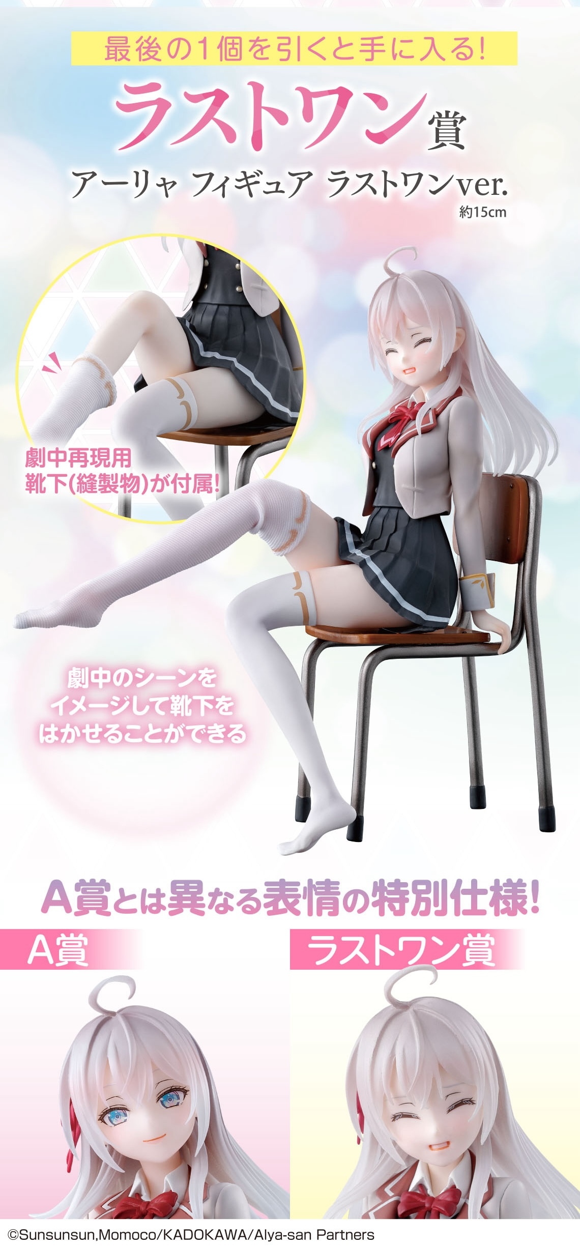 而最後一賞和雙重中獎賞則是以A賞為基礎打造的最後一賞Ver.,除了艾莉被政近打亂節奏而害羞的表情,最大的看點絕對是附贈的那隻布製長襪,讓各位紳士能夠親身體驗為她穿襪子的感受!