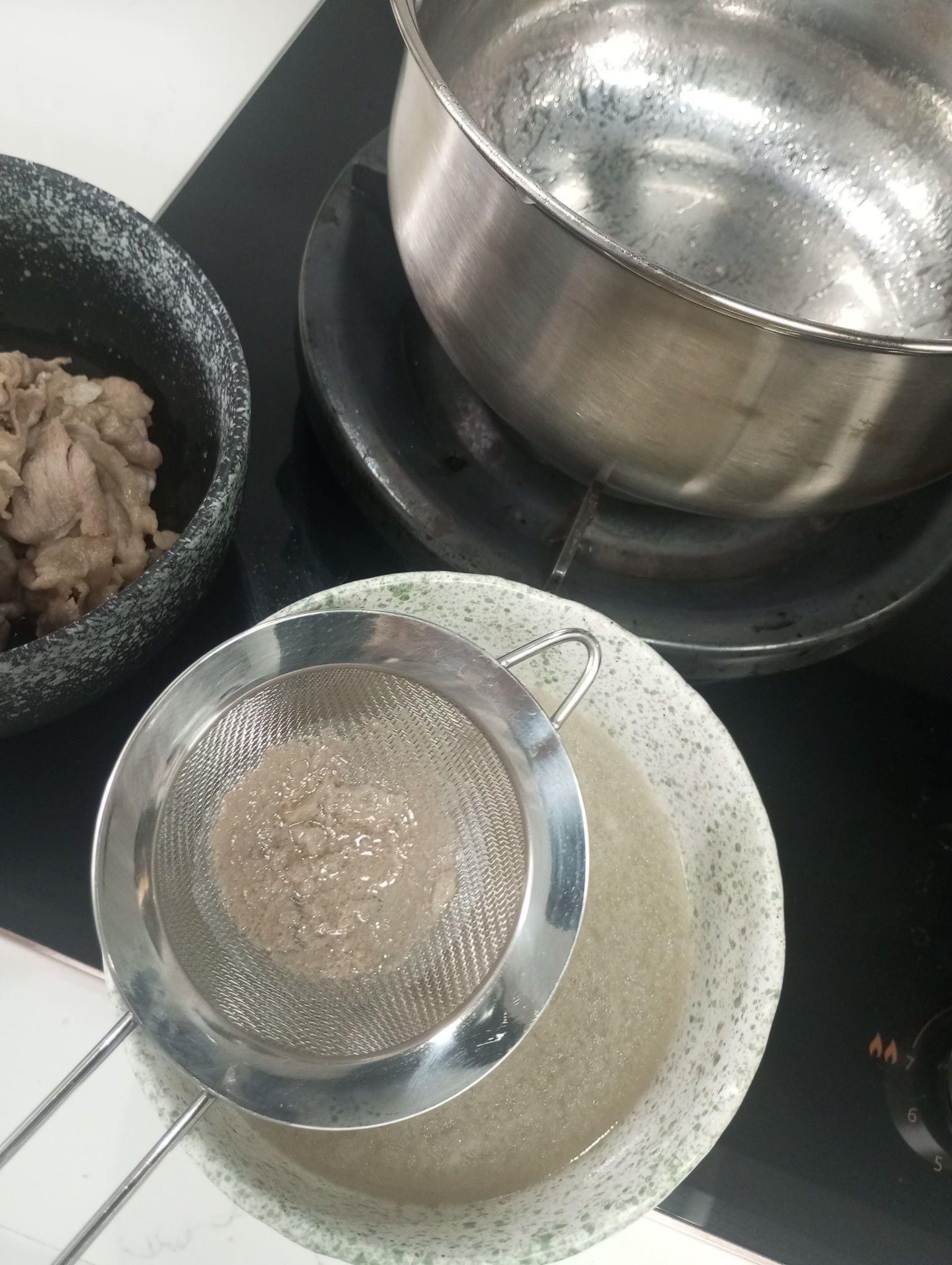 加入肥牛卷开大火30秒,看肥牛卷没有血色就可以捞出,烫过肥牛卷的水用滤网或纱布过滤掉浮沫后倒出备用,不在乎浮沫的坛友可以跳过这一步,能节省3分钟左右;