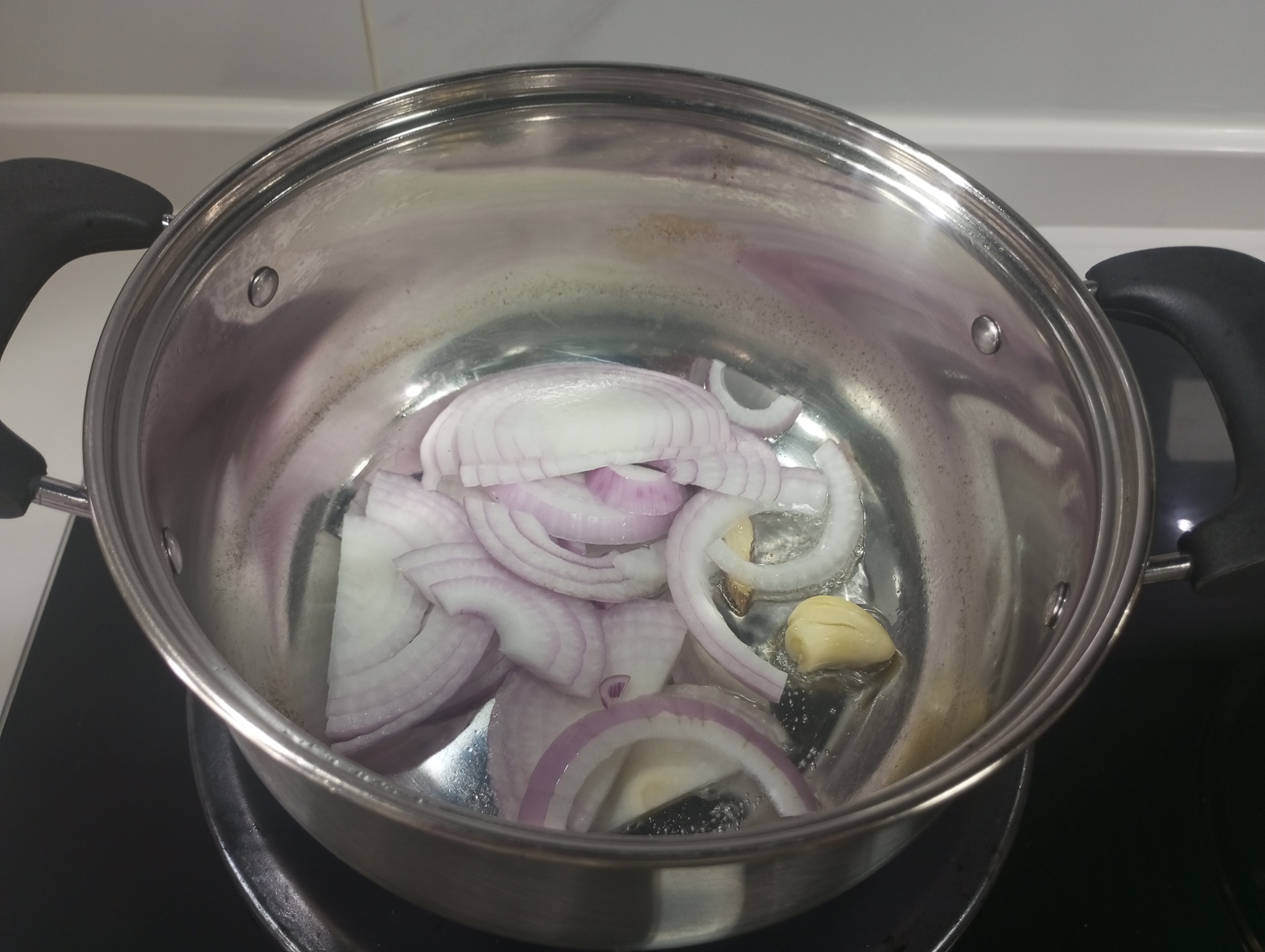 4. 简单用厨房纸擦一下锅或者冲洗下擦干,锅底倒入食用油,尽量不用花生油等自身味道较重的油,可以稍微多点,小火加入洋葱、姜片、蒜,