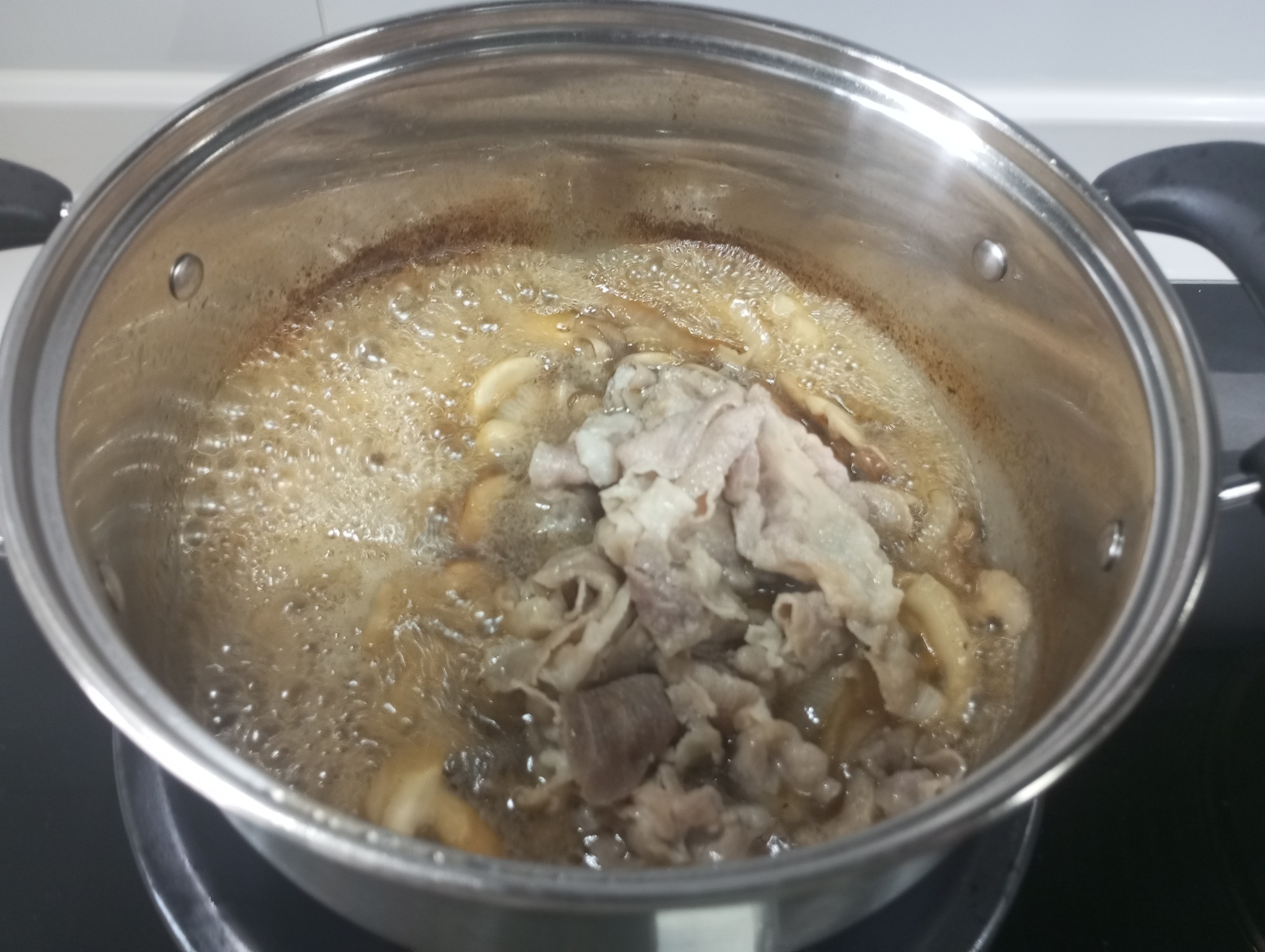 6. 中火水滚后不停搅动,直到水剩三分之一,这时候洋葱应该处于有形体没口感的阶段,加入烫好的肥牛卷转大火快速搅动收汁,剩多少汤汁就看个人口味了;