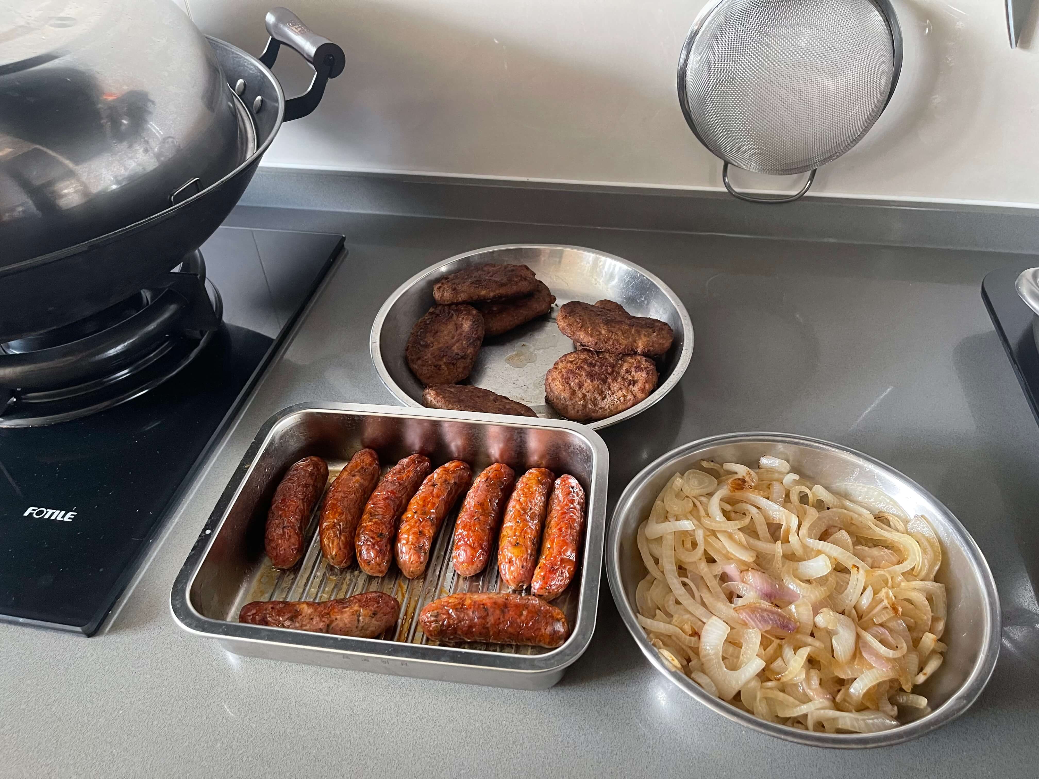 牛肉饼和香肠表示:你用力点,我还受得了。所以还得要在煎肉饼的时候下手。在我把洋葱和黄瓜片去除了之后,勉强能够啃一口