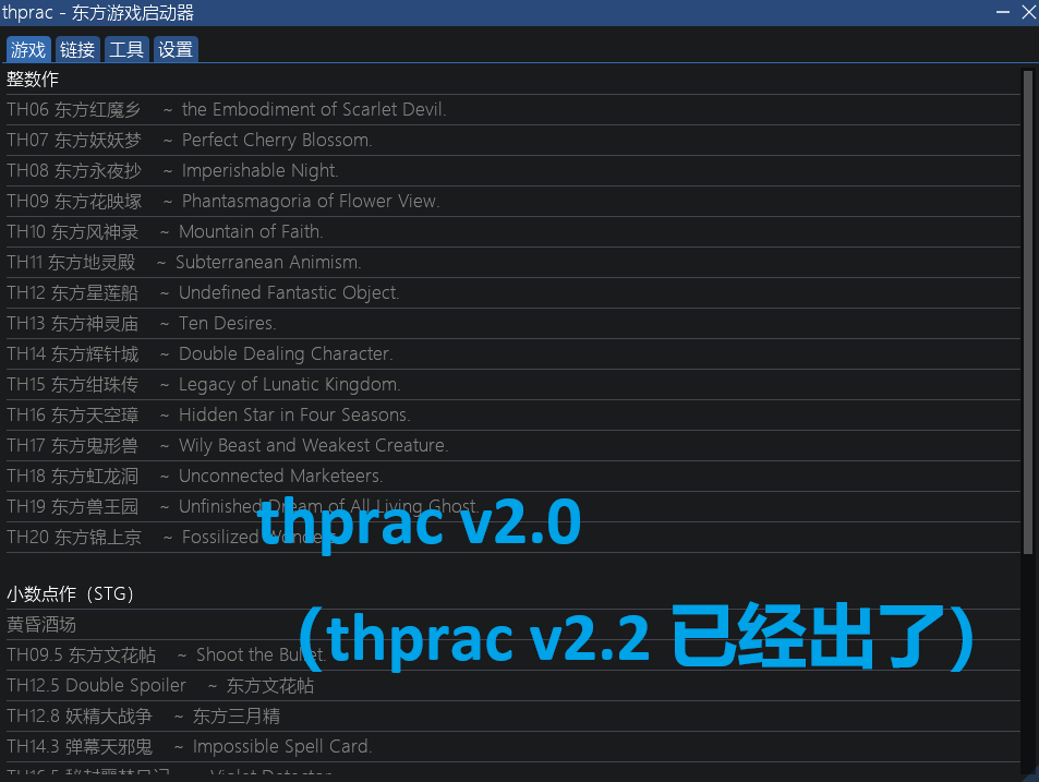 - Launcher: Add th20 to rolling feature and thcrap integration (e255af8531fe3938c9826e0ac8fb5e045ffea152) @H-J-Granger