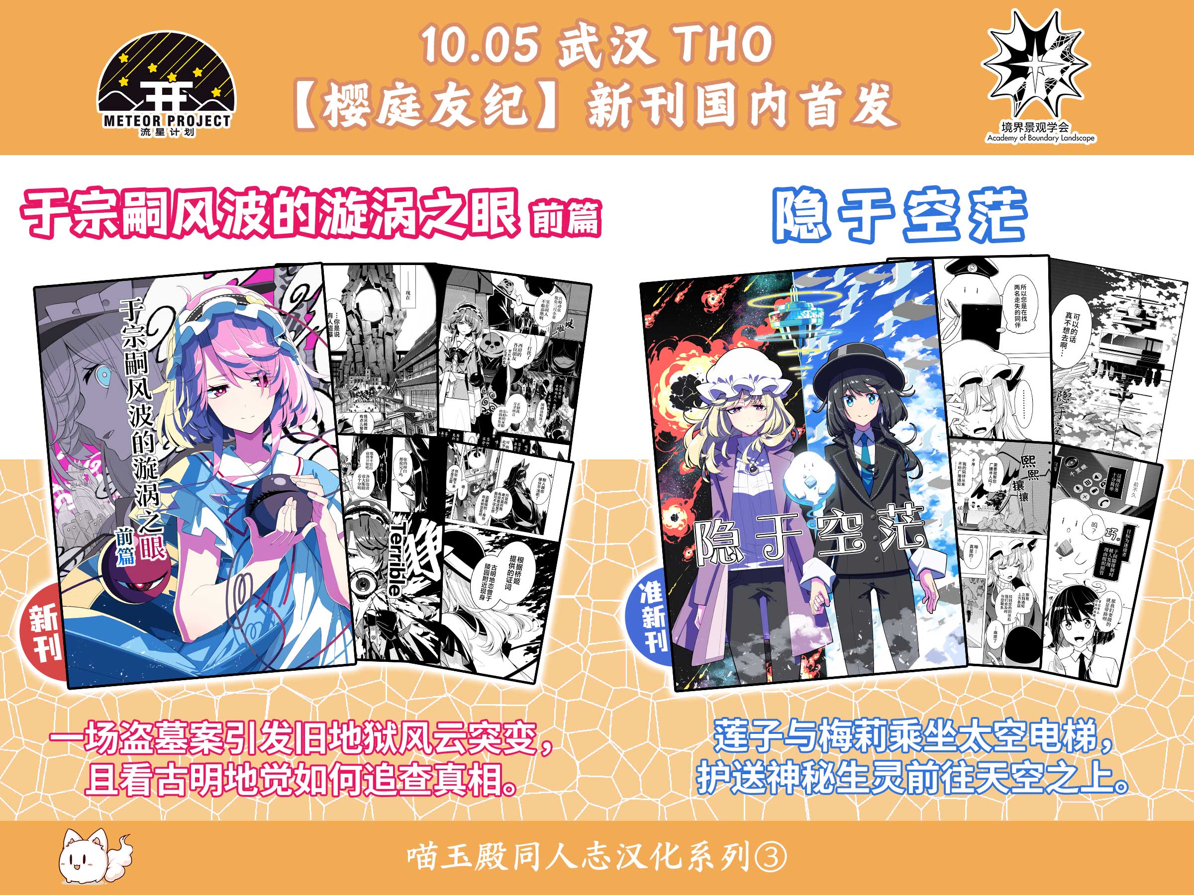 樱庭友纪C106新刊《于宗嗣风波的漩涡之眼 前篇》即将于10月5日武汉THO·东方花映月展销会上,由“流星计划”代理发售,摊位号为“A8”。 届时,樱庭友纪春例新刊《隐于空茫》也将由“境界景观学会”继续销售,摊位号为“A11·12”。此外,喵玉汉化组也将参与本届武汉THO,将于“网站专区-6号”摊位销售醉蝶华、三月精等官方出版作品。欢迎各位新老朋友前来光顾!