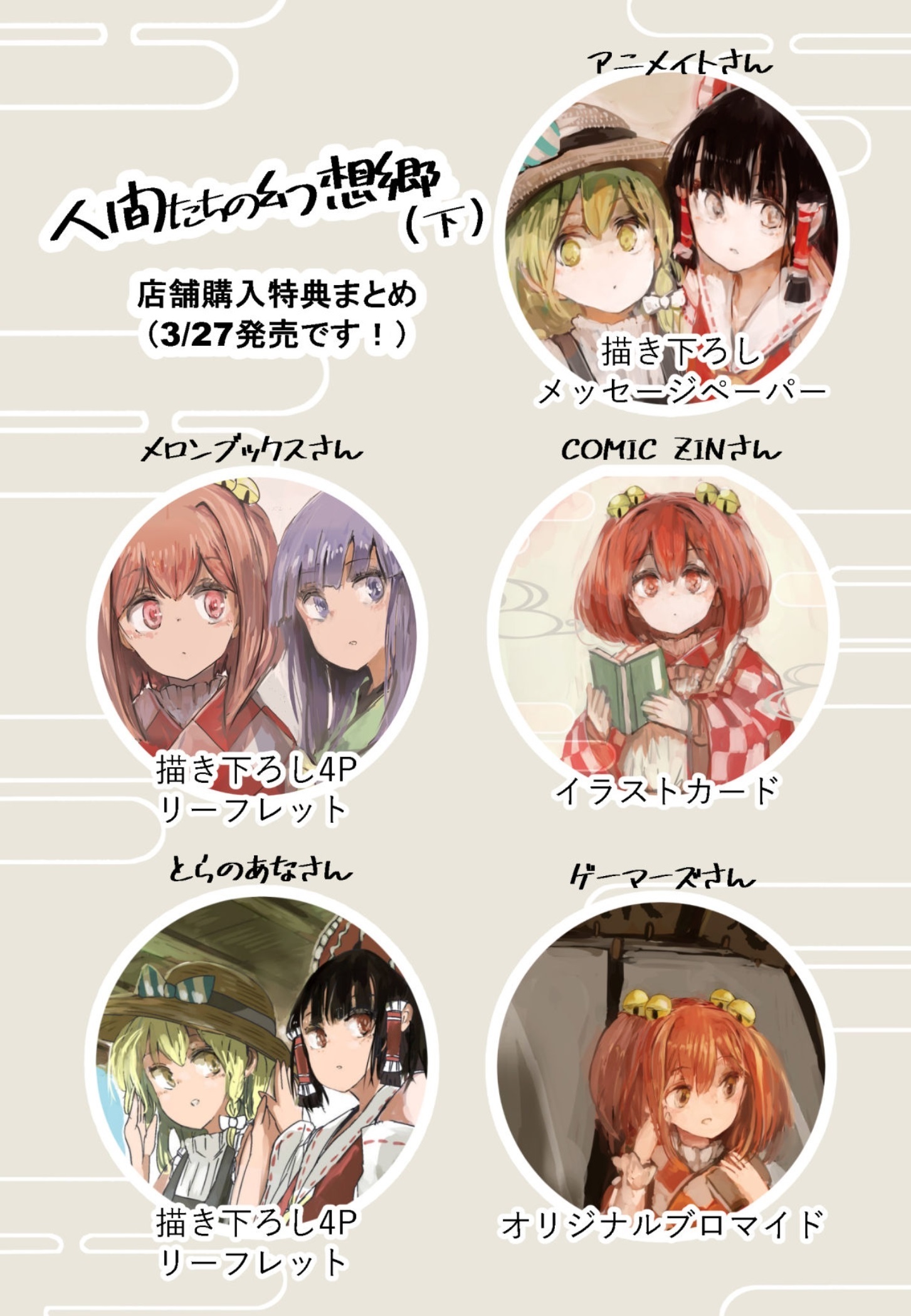 《人类们的幻想乡》单行本下卷共有五种店铺特典,其中MelonBooks和虎之穴的书店特典为首次发布的附赠漫画,特对此进行汉化。