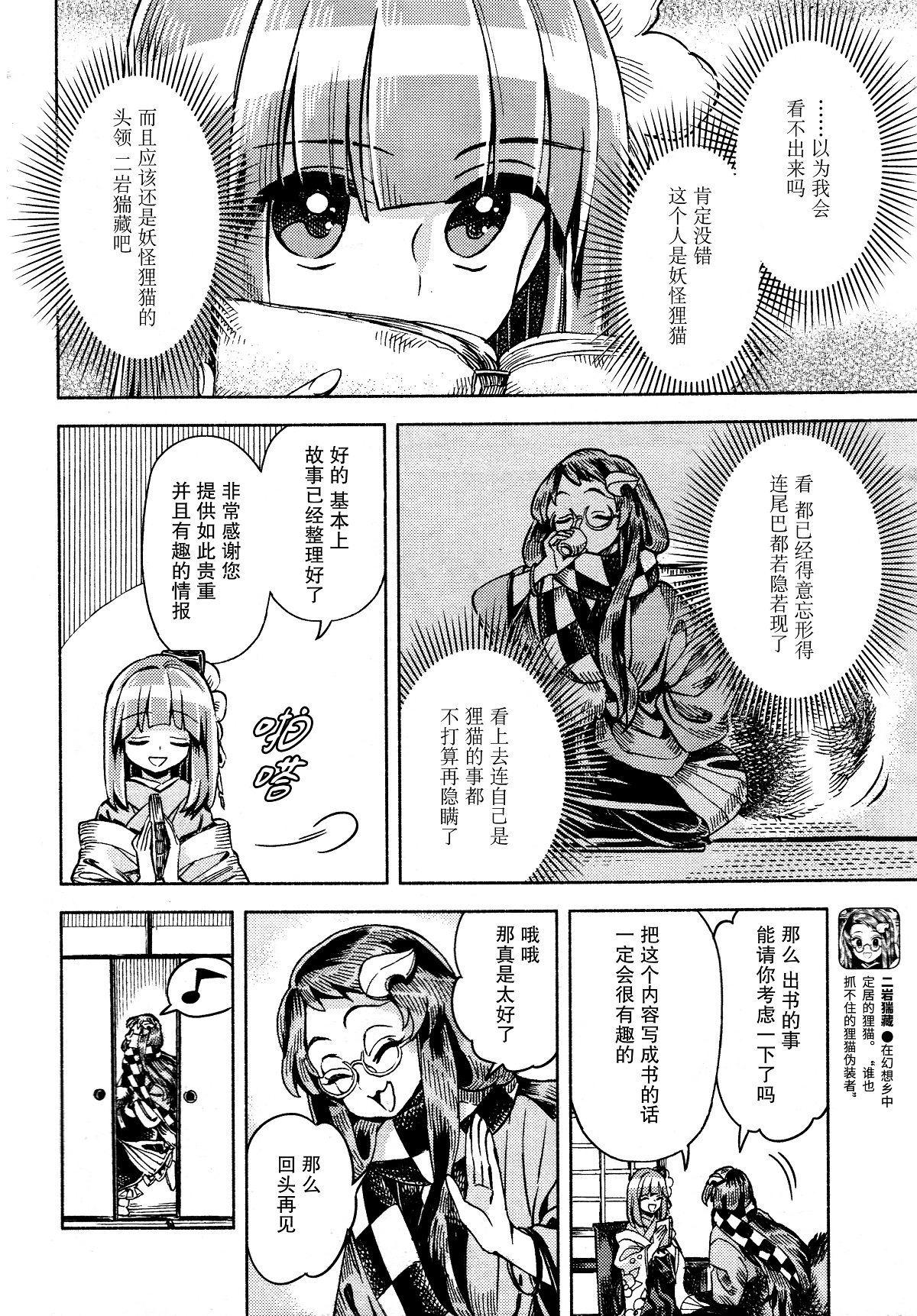 13.自第四话以来一直没有人形猯藏在铃奈庵时被灵梦目睹的场景,所以灵梦并不是早就发现人形猯藏长期混迹铃奈庵然后刻意不提醒小铃,而是这次阿求认出来后告诉她猯藏的出没情况的;