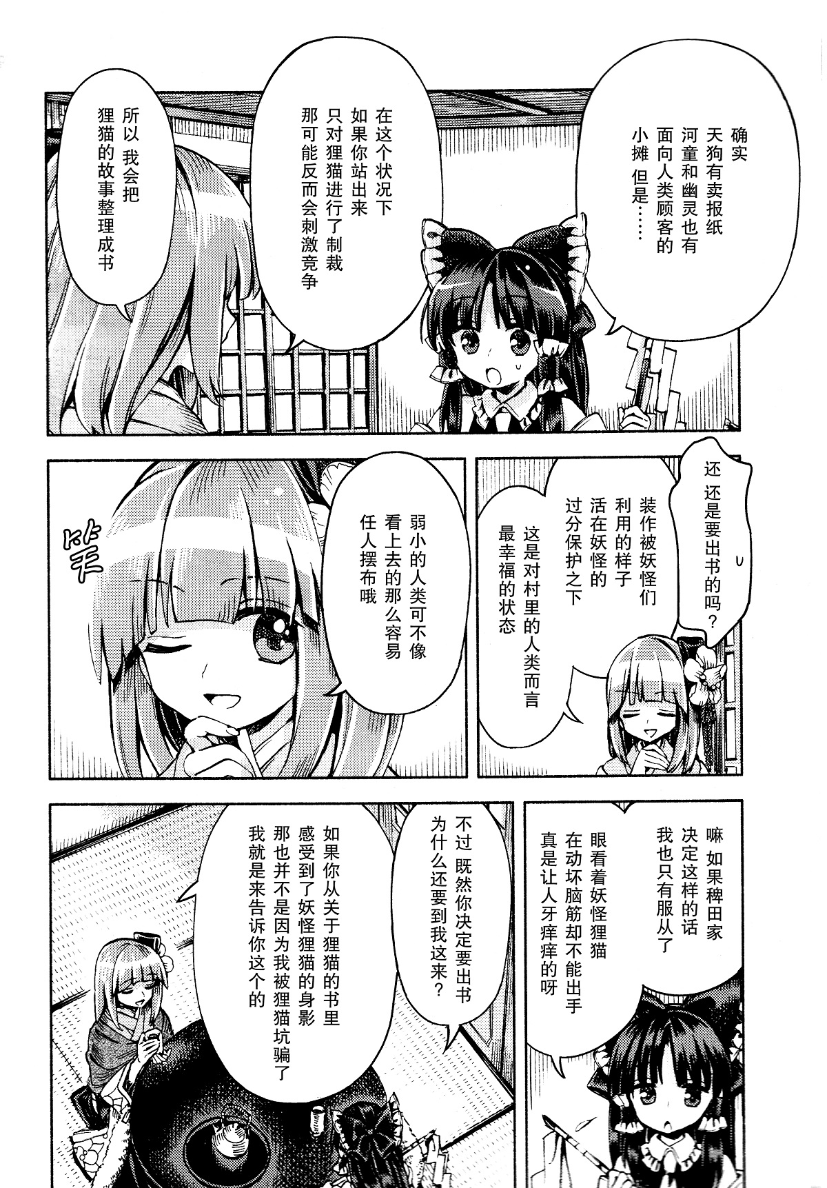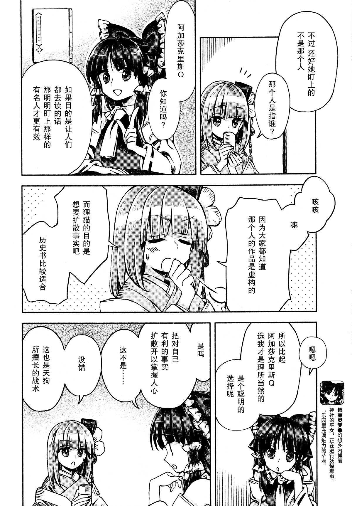 11.“如果稗田家决定这样的话,我也只有服从了”←灵梦摆出了“稗田家”的名号,所以不是光出于和阿求的交往而让步,这是本话最大的重点,而且很可能不是人里的常识。即,在对人里的管理上,虽然术业有专攻,但博丽神社的权限总体说来是不能和稗田家比的,不过稗田家还是要给足博丽神社面子。