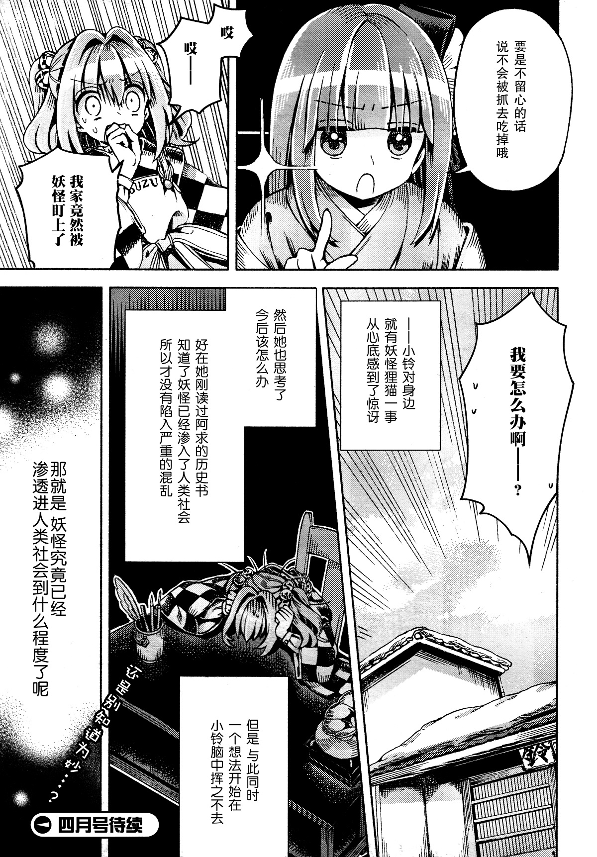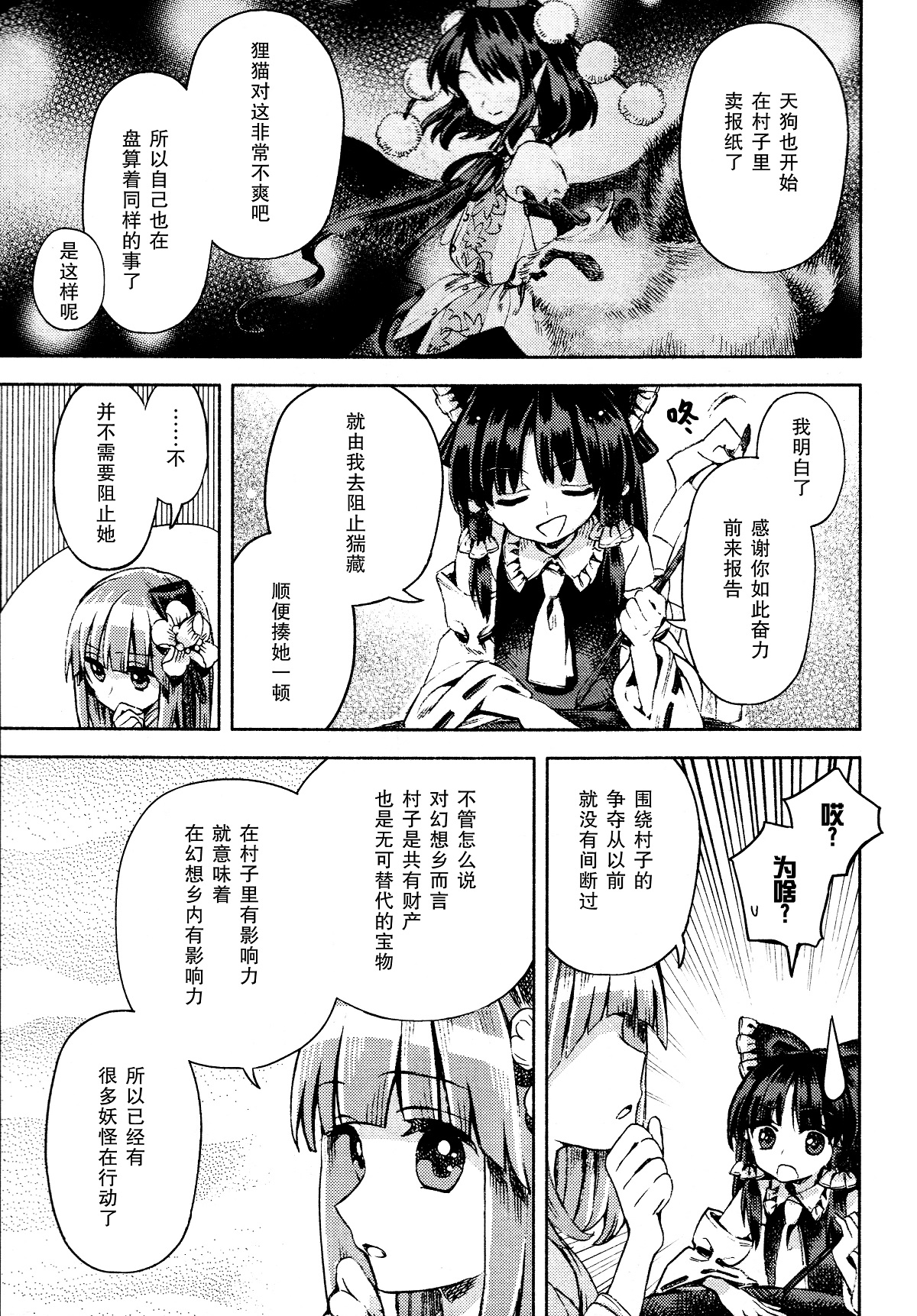 4.“稗田家的哲学”点题,但是稗田家和稗田阿求的主张并非完全一致,所以要分开讨论。出于稗田家的立场,阿求先去找了灵梦,告知她狸猫的入侵意向,然后谁也不得罪;出于阿求的立场,她又去提醒了小铃……真的如此简单吗?阿求为何认为要回避稗田家来见灵梦?首先是因为稗田家有人在监视阿求,其次是因为稗田家不会同意阿求到神社来后的某一行为,可能是和博丽的巫女之流串通,可能是不拒绝妖怪,也可能是别的;