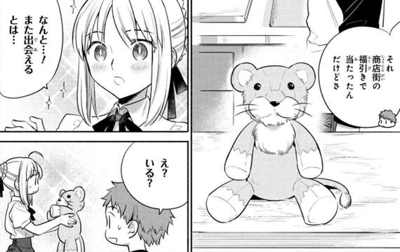 原來是因為在金閃閃逛街購物期間,獅子玩偶就被衛宮士郎抽走,而且送給了Saber。主角威能再度大獲全勝XD