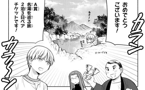 由於幸運爆棚+黃金率屬性,金閃閃抽中了A賞的知名溫泉3天2夜旅行獎!