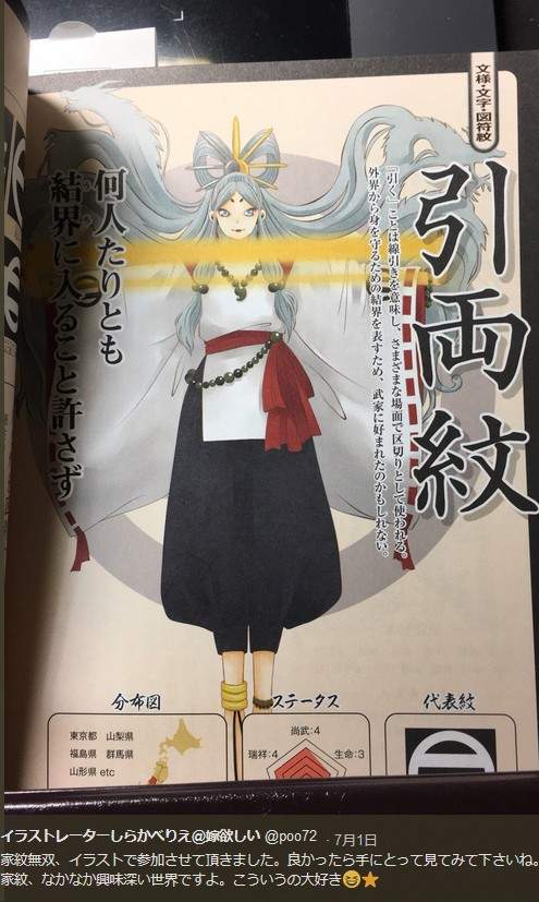 本書好像收錄了82種家紋的擬人化,以及902種的變化型家紋...看來這本除了有美美的人設可以看以外,龐大的資訊量也夠大家閱讀一段時間了,今天收集了些書中的插圖,看完有興趣的朋友可以找管道入手,在日本發售時間好像就是這個月5號,所以應該找得到就補萌大奶~!~