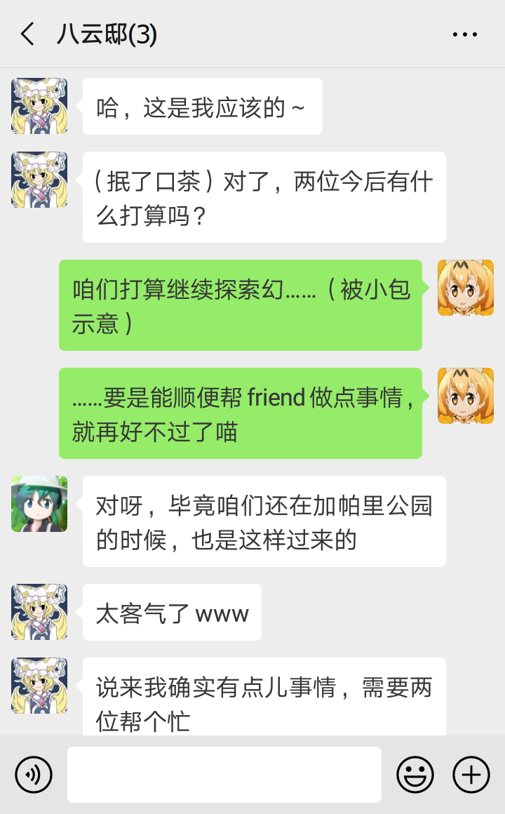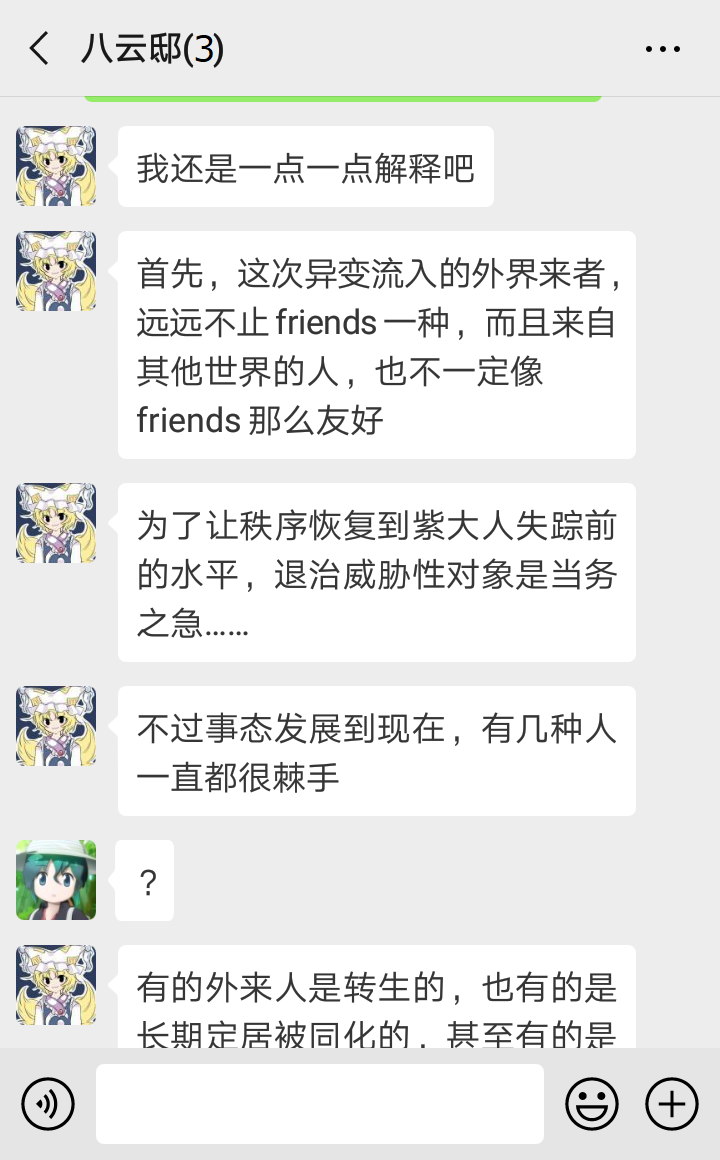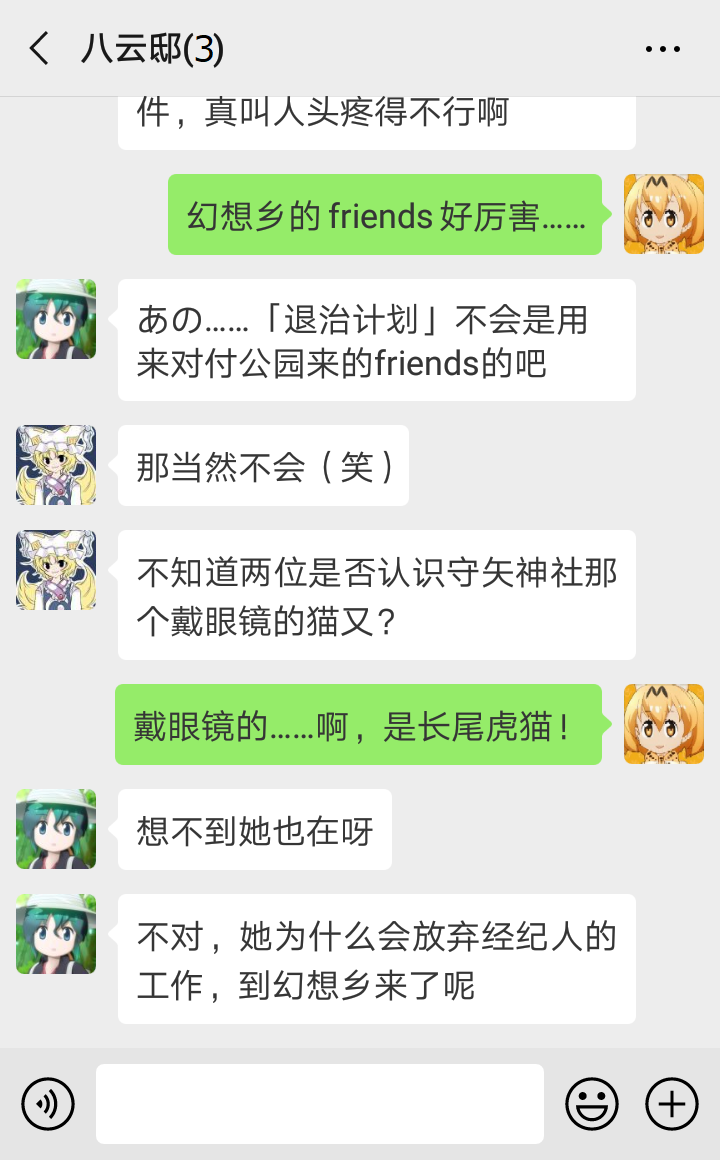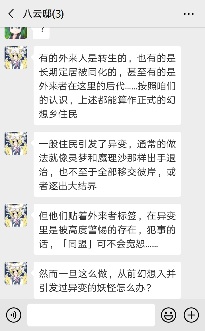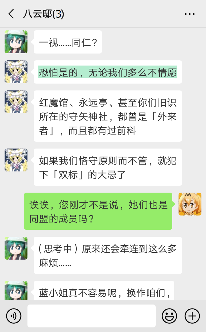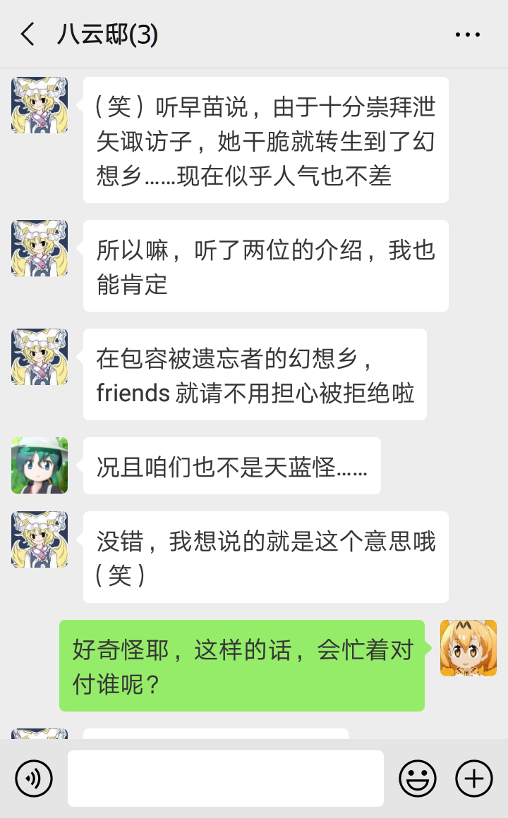 “我知道我知道~慧音老师说,比起妖怪,其他世界来的人要危险得多,所以传言妖怪都在联手退治外来的坏人,对村落住民变友好了……似乎大家真的没在意我们的存在了呢~”