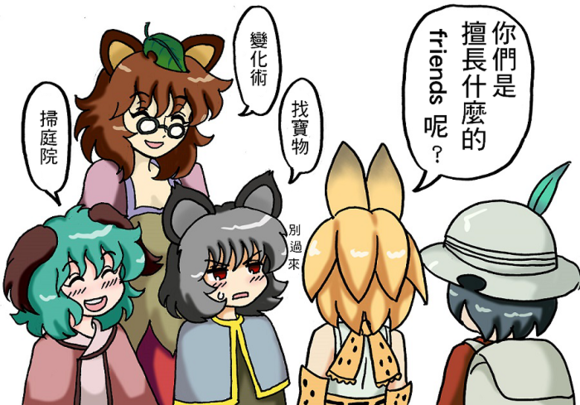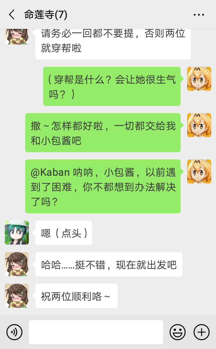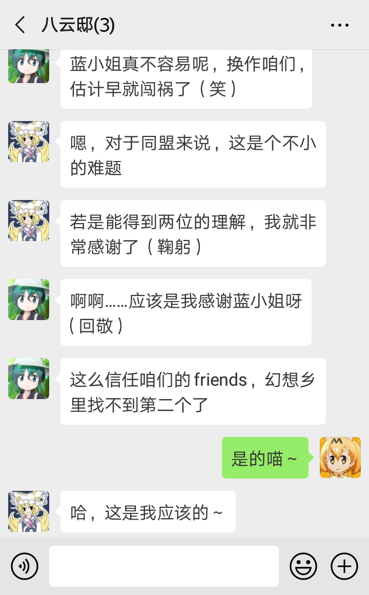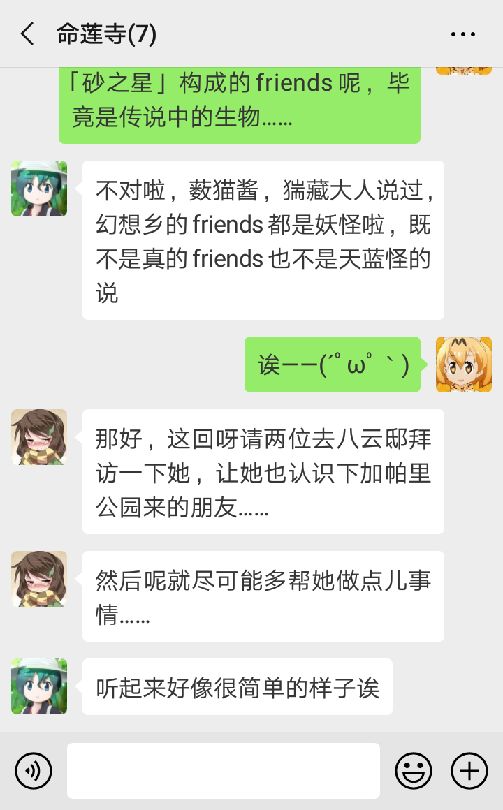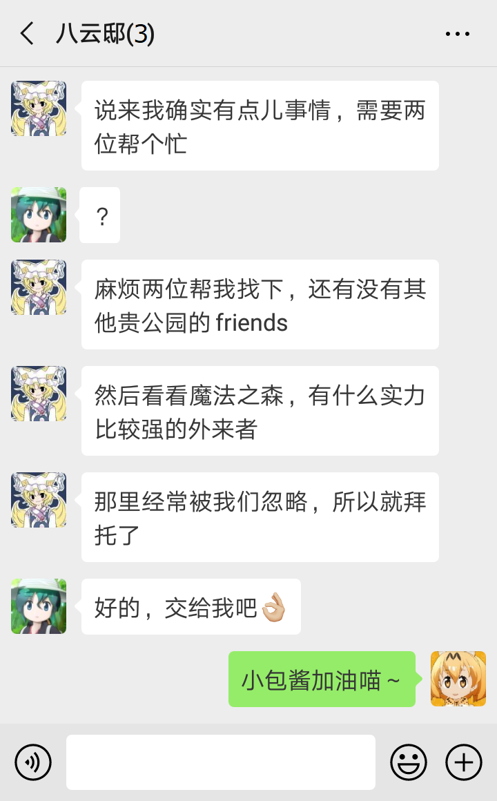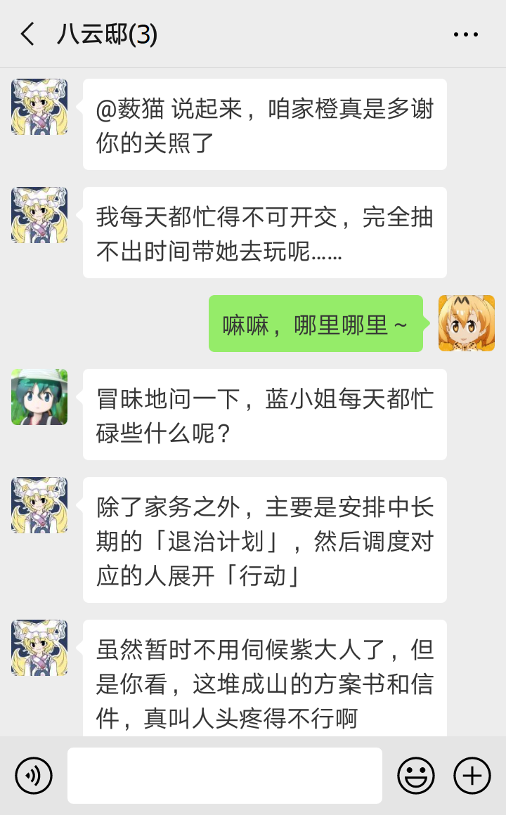 “我知道我知道~慧音老师说,比起妖怪,其他世界来的人要危险得多,所以传言妖怪都在联手退治外来的坏人,对村落住民变友好了……似乎大家真的没在意我们的存在了呢~”