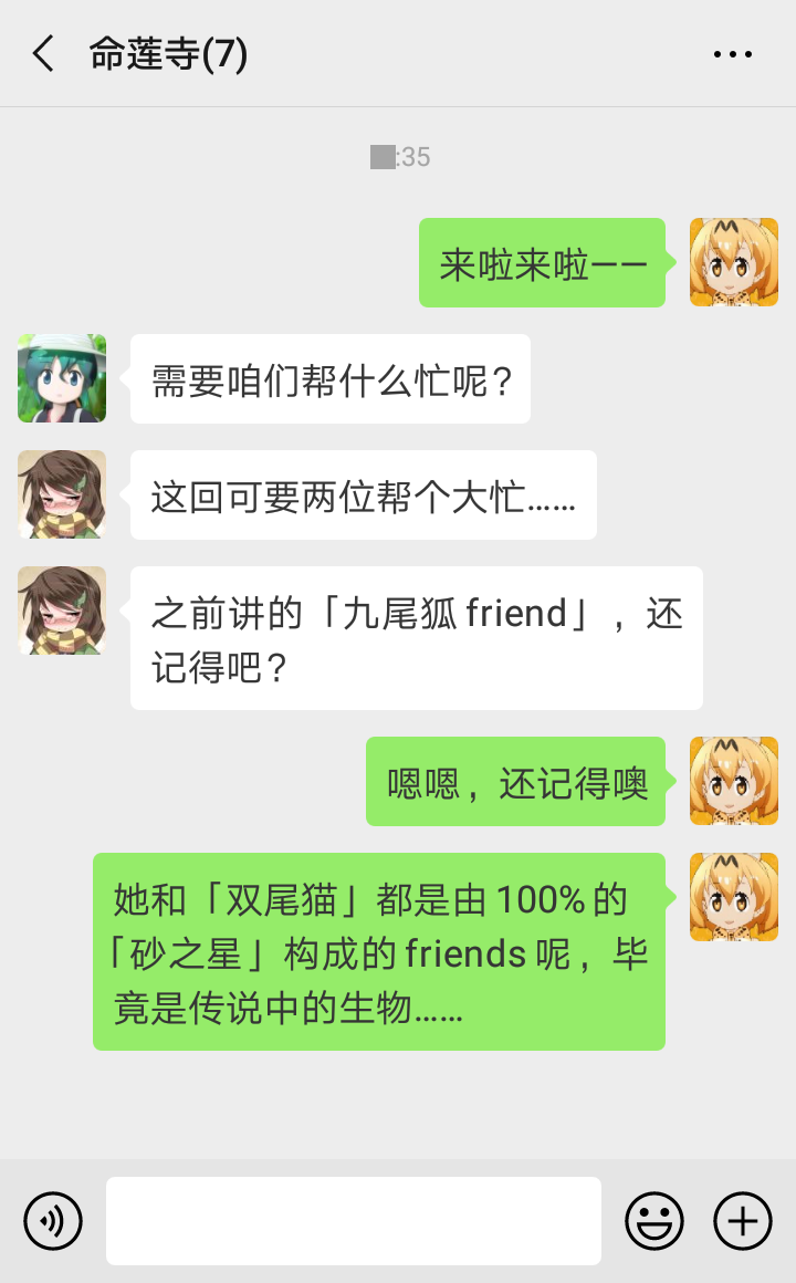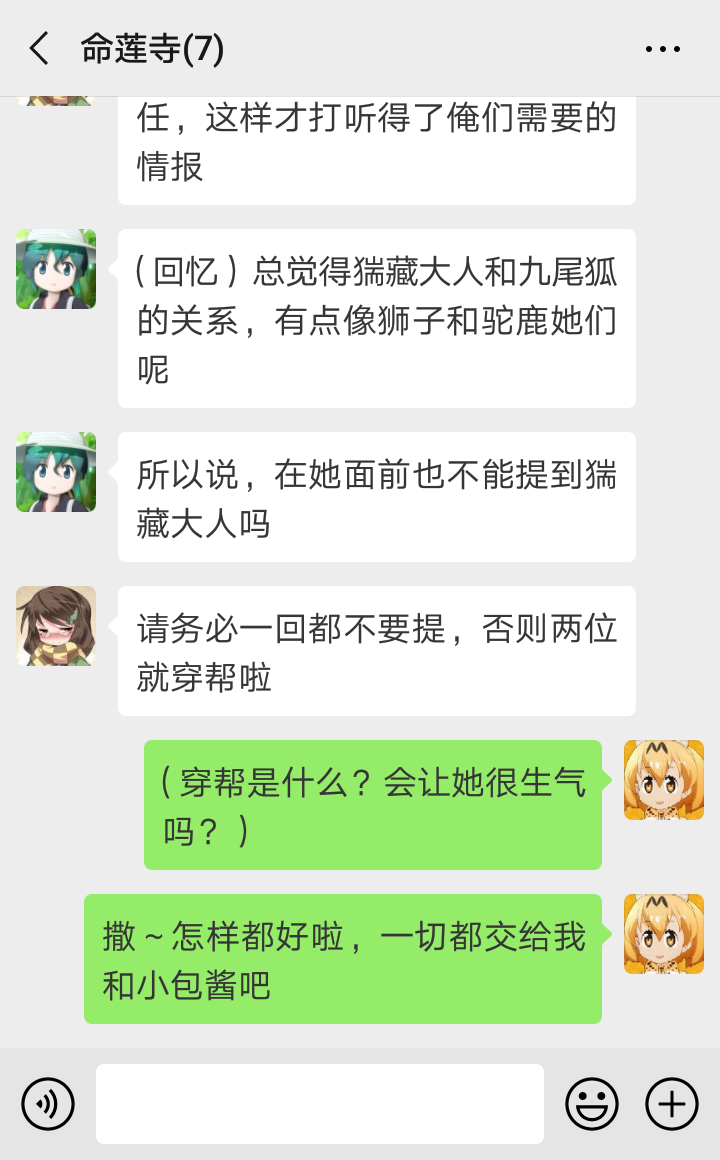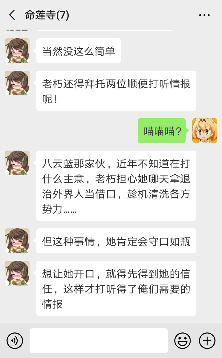 “嗯嗯,看来今天也有专心听讲哦,真棒~”每当接送橙放学的时候,蓝的心情是最好的。乘着自家式神用功学习的自豪感,她从宽大的袖子里,取出一串刚买的团子予以奖励。“那么现在,你知道为什么咱们能光明正大地,在村落露出耳朵和尾巴了吗?”