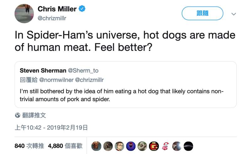 所以,豬豬人吃的熱狗到底是用什麼做的呢?《蜘蛛人:新宇宙》製作人 Chris Miller在個人推特表示:豬豬人宇宙熱狗用的都是人類的肉,哈哈哈,絕對不是同類相殘,這樣感覺比較好了嗎?