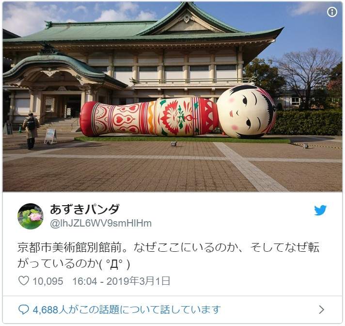 對有「巨物恐懼症」的人來說,日本那些矗立觀光景點的大佛確實是遠看都覺得不舒服的存在,京都市美術館別館前突然出現的巨型木芥子在推特上引發話題,原本矗立館前的木芥子最近突然翻倒在地,這怎麼看都只找到違和君的畫面當然也讓推民熱論起背後的真相...